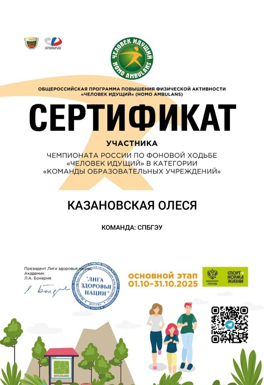 Основной этап соревнований проходил с 1 по 31 октября 2025 года. В среднем участники нашей команды ежедневно делали в фоновом режиме 332 тысячи 180 шагов. Такие показатели фоновой активности обеспечили команде СПбГЭУ при подведении итогов 1 место в северо-западном регионе и 15 место в России из 260 коллективов образовательных учреждений.
