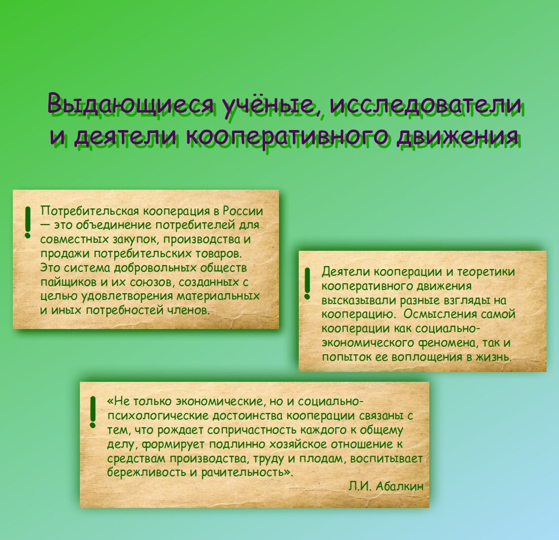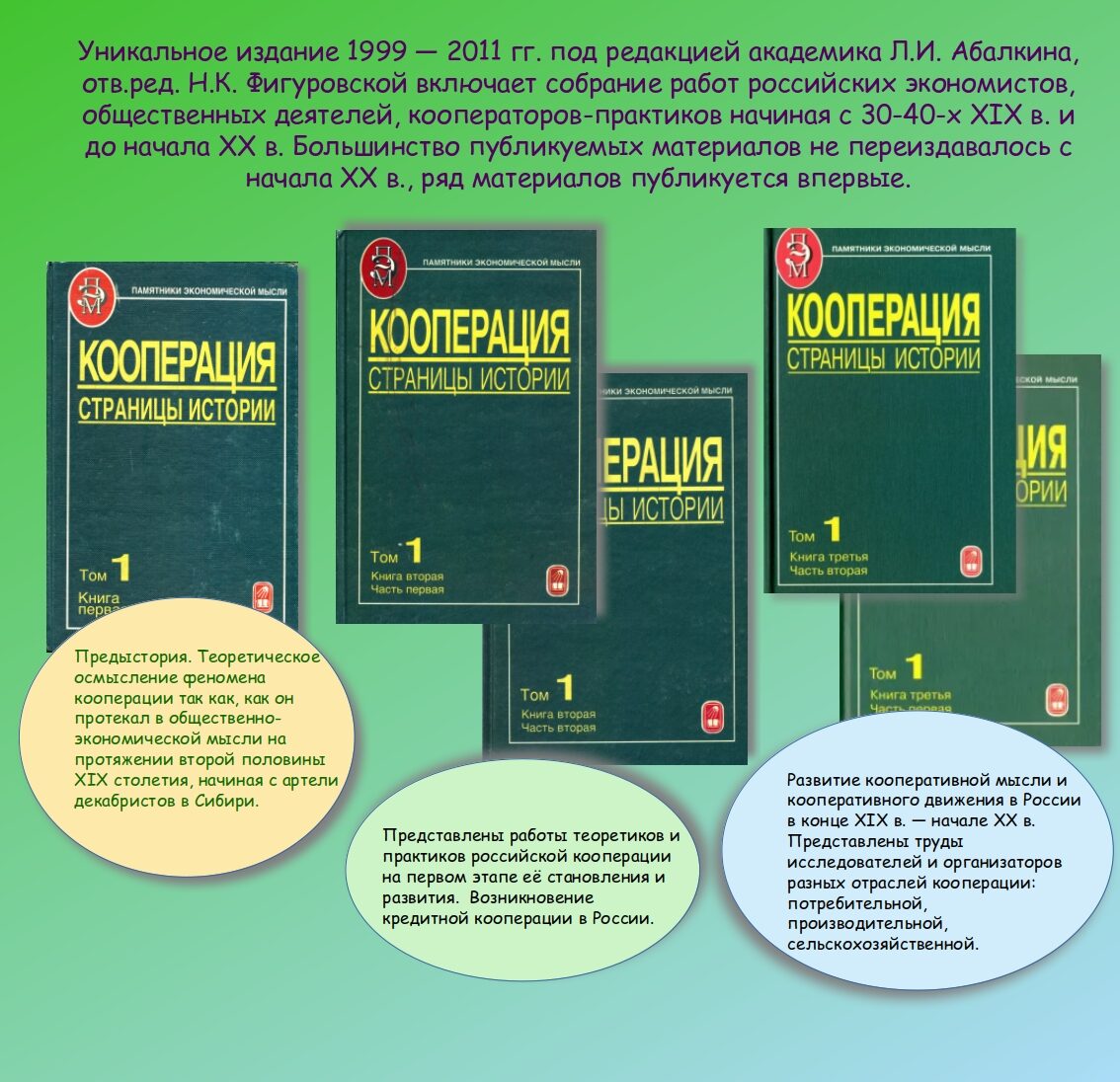 Вопросы истории кооперативного движения в России нашли глубокое отражение в трудах отечественных учёных. Исследования были посвящены различным аспектам развития кооперации: экономическим, социальным, правовым, культурным. Теоретики кооперативного движения — А.В. Чаянов, М.И. Туган-Барановский, И.Х. Озеров и другие — внесли неоценимый вклад в разработку общей теории кооперации и осмысление её роли в экономической жизни страны.