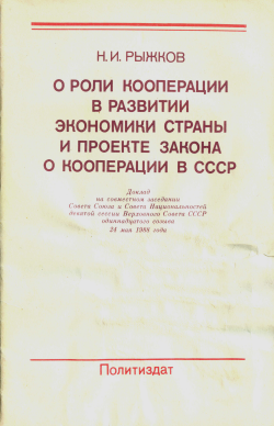 В докладе Н.И. Рыжков, председатель Совета министров СССР (1985-1991), рассматривал роль кооперации в развитии экономики страны. Он считал, что кооперация способствует более полному использованию возможностей социализма, приумножению общественного богатства, насыщению рынка товарами и услугами, предлагал гарантировать гражданам право добровольного вступления в кооператив и свободного выхода из него, участие в управлении всеми делами кооператива, самостоятельность коллективного хозяйствования и независимость кооператива в принятии решений.