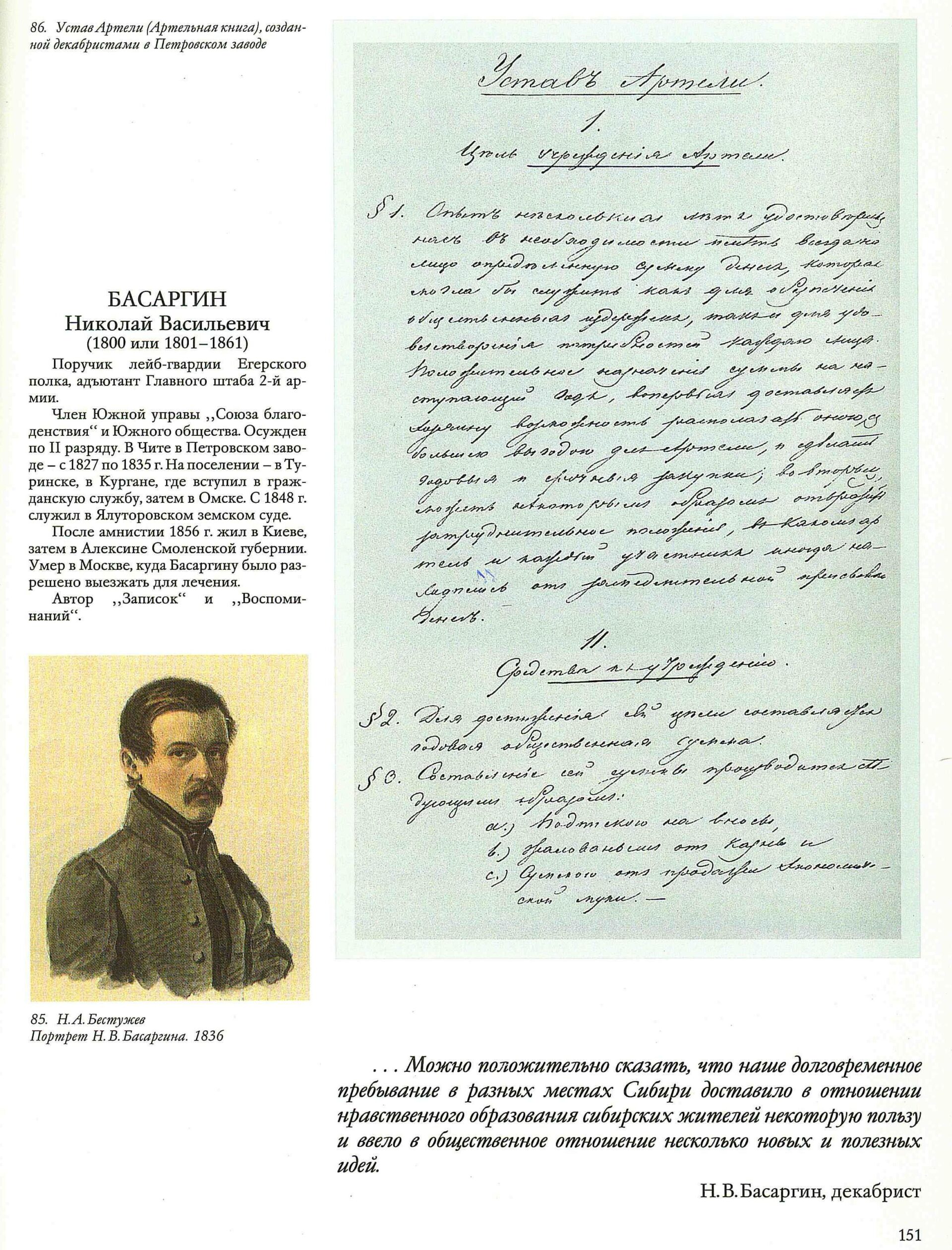 В сборнике собраны мемуары, публицистика и рассказы декабриста Николая Васильевича Басаргина, освещающие декабристское движение, жизнь крепостных крестьян и социальные проблемы дореформенной России. «Записки» Басаргина содержат сведения о жизни декабристов в Сибири, историю появления Большой и Малой артелей, их устройство, полный устав Большой артели.