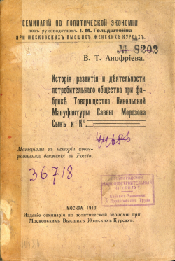 Издание вышло в рамках семинара по политической экономии под руководством И. М. Гольдштейна при Московских высших женских курсах. Книга посвящена истории развития и деятельности одного из старейших потребительских обществ при фабрике Товарищества Никольской мануфактуры «Саввы Морозова сын и Ко»: возникновение общества, его цель, особенности его деятельности.