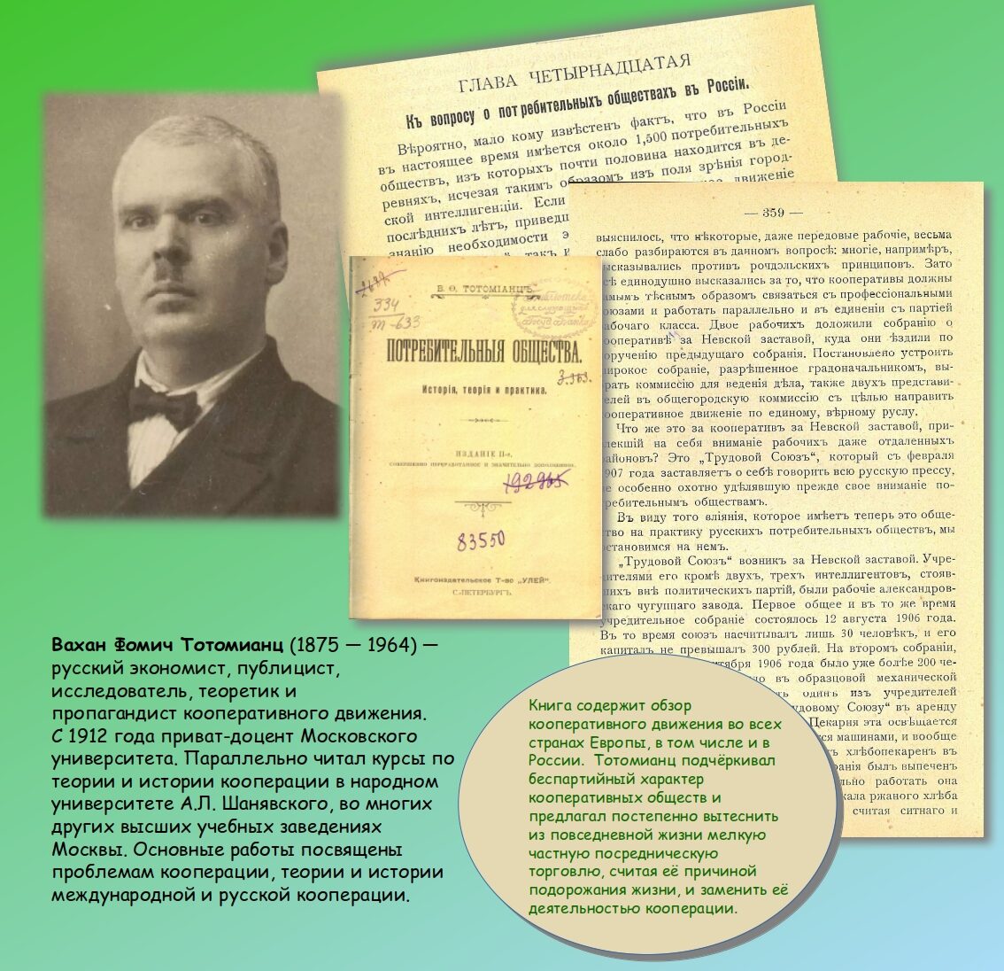 Приглашаем в библиотеку (наб. канала Грибоедова, д.30-32, Литер А) всех желающих познакомиться с почти двухвековой историей потребительской кооперации России — от декабристской артели до современной цифровой системы. Выставка будет полезна студентам экономических и юридических специальностей, а также всем интересующимся историей отечественного предпринимательства и социально-экономических институтов.