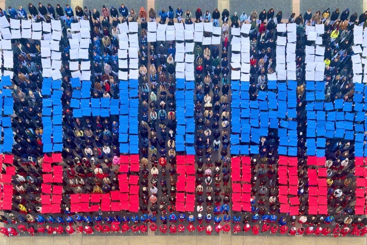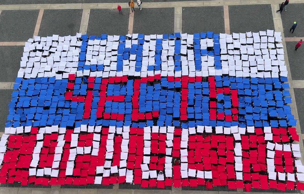 Участники живого флешмоба выстроились в три символичные надписи: «Путин», «Россия», «Сила. Честь. Гордость». Это яркое событие продемонстрировало единство и поддержку молодежью курса национального лидера.