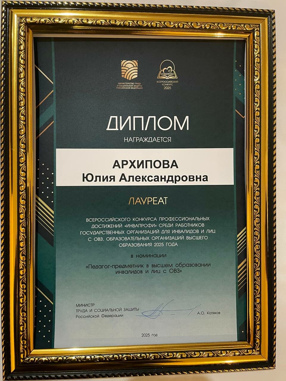 Доцент кафедры физической культуры Юлия Александровна Архипова вошла в пятерку сильнейших в номинации «Педагог-предметник в высшем образовании инвалидов и лиц с ОВЗ».