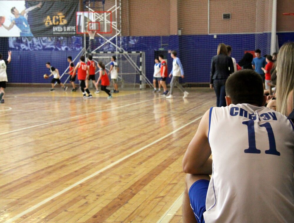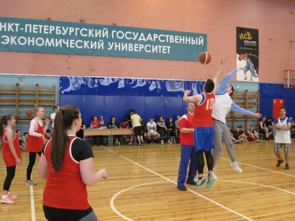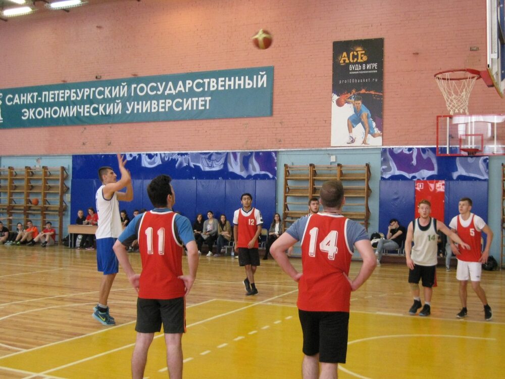В промежутках между играми свое мастерство демонстрировали члены сборной команды СПбГЭУ по баскетболу, выполняя броски в корзину различными эффектными способами.