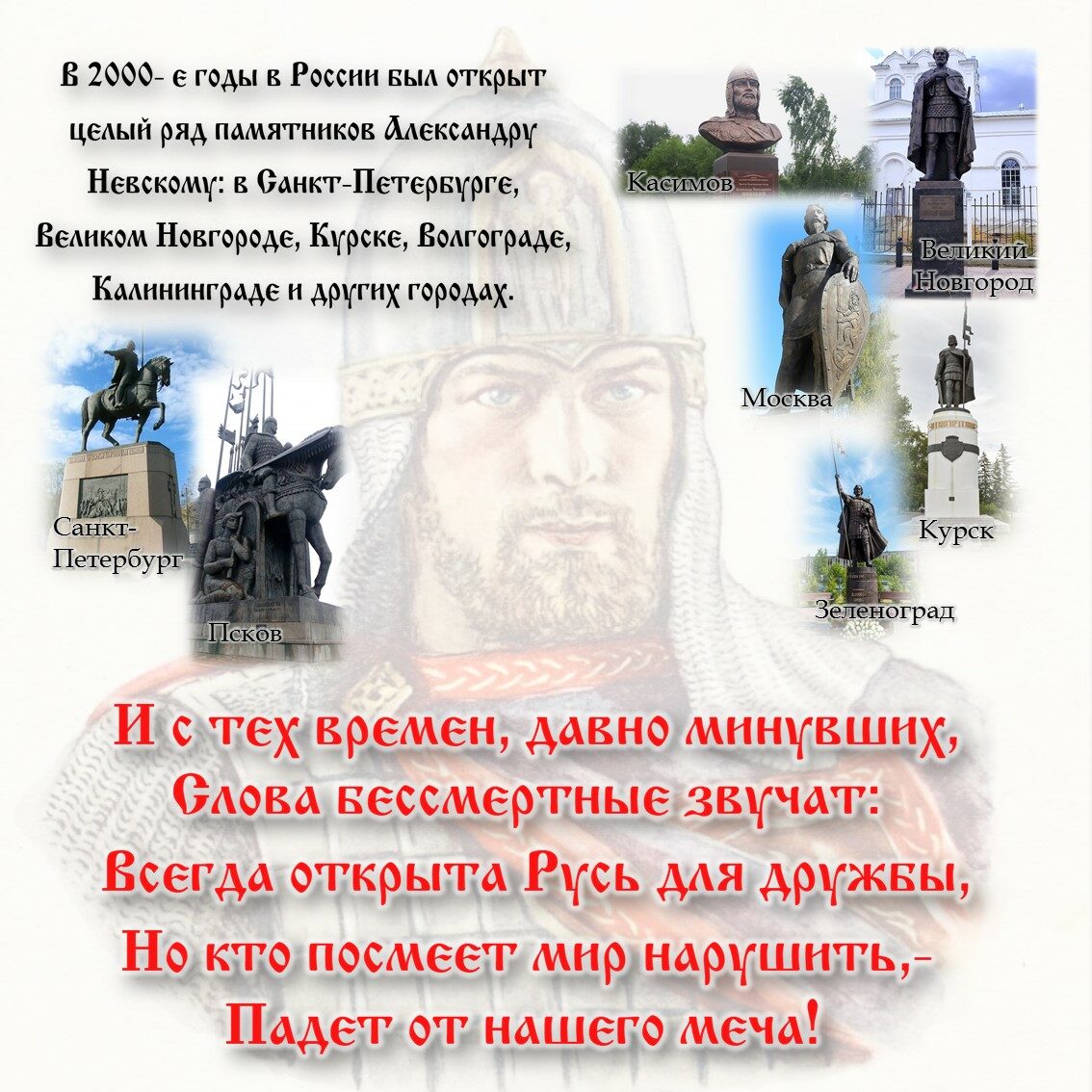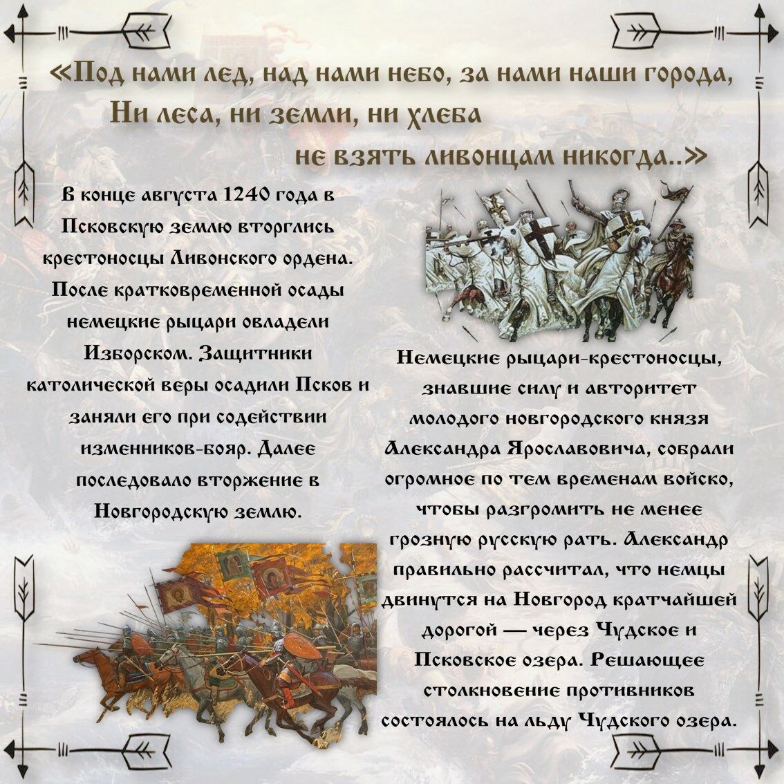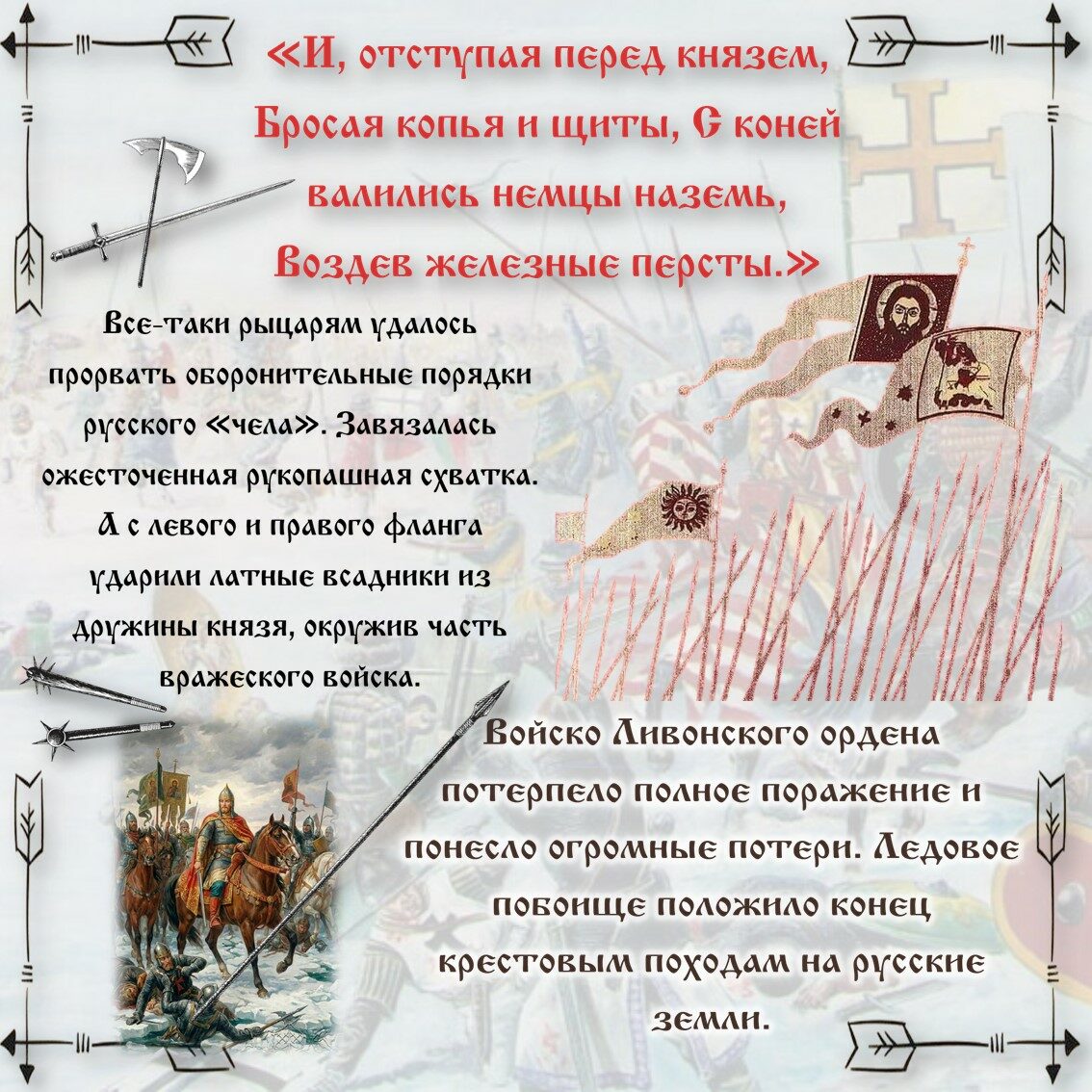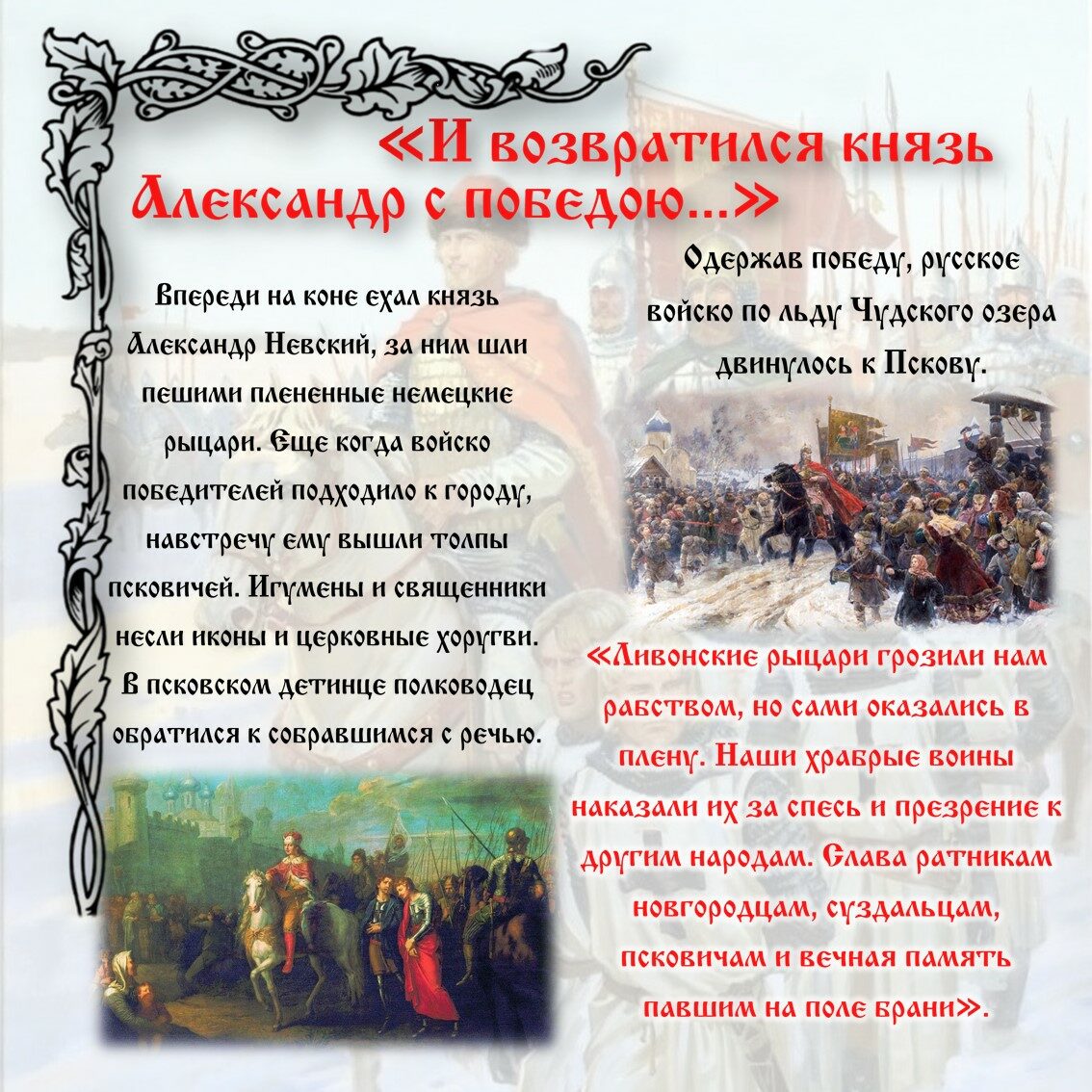 18 апреля (5 апреля по старому стилю) в России празднуется День победы русских воинов князя Александра Невского над немецкими рыцарями на Чудском озере (Ледовое побоище, 1242). Это важное историческое событие стало символом мужества и героизма наших предков и способствовало сохранению независимости и культурного наследия русского народа.