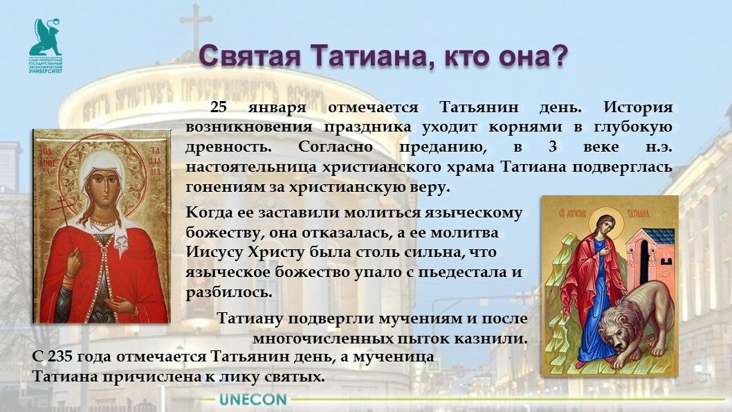 «Татьянин день», который ежегодно отмечается 25 января, имеет православные корни. Традиция праздновать Татьянин день зародилась в храмах в память о мученице Татиане Римской, жившей во II-III веках н.э. Она была воспитана в христианской семье и всю свою жизнь посвятила служению богу. Во время гонений на христиан, организованных при римском императоре Севере, Татиана была схвачена и после пыток казнена. Позже Татиану Римскую провозгласили святой, а день ее смерти стал днем именин всех Татьян.