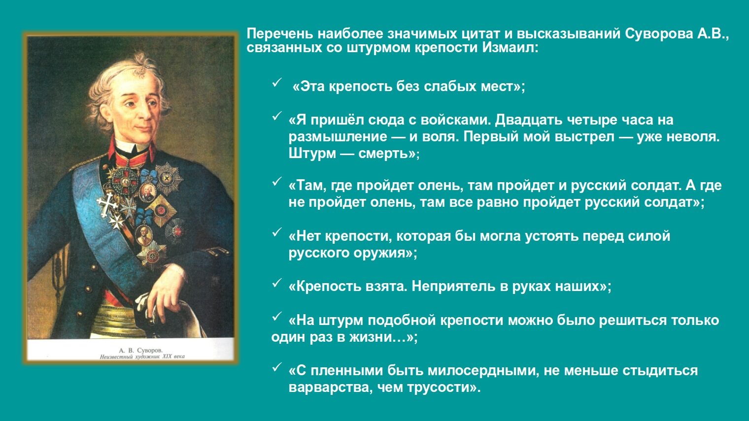 24 декабря исполняется 235 лет со дня легендарного штурма турецкой крепости Измаил под командованием А.В. Суворова. Это событие вошло в историю как символ непревзойдённого мужества, доблести и стратегического гения русской армии. С 1995 года этот день отмечается как День воинской славы России.