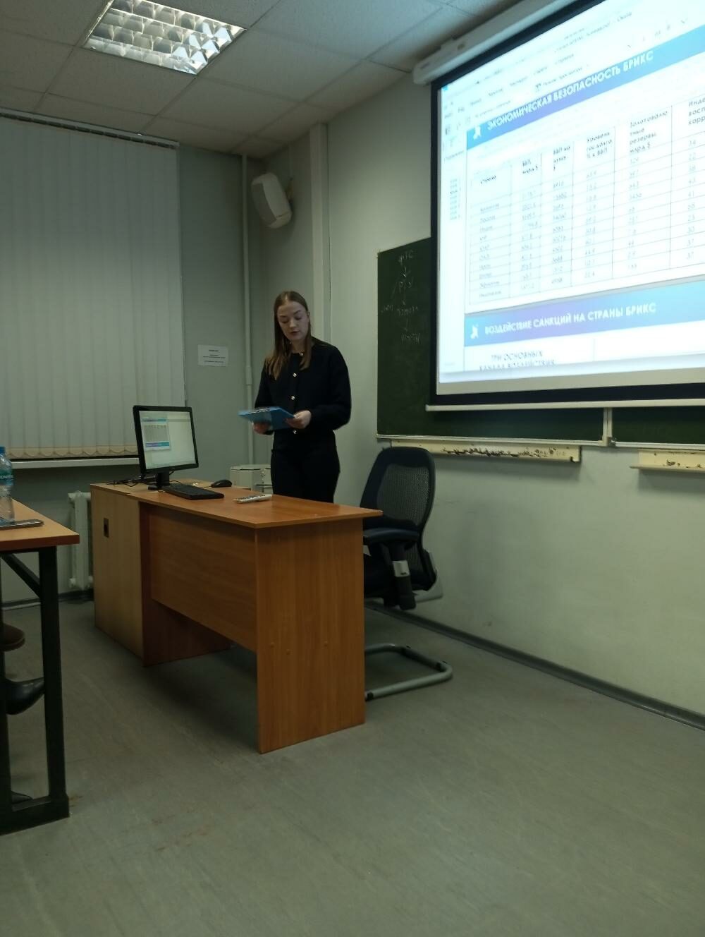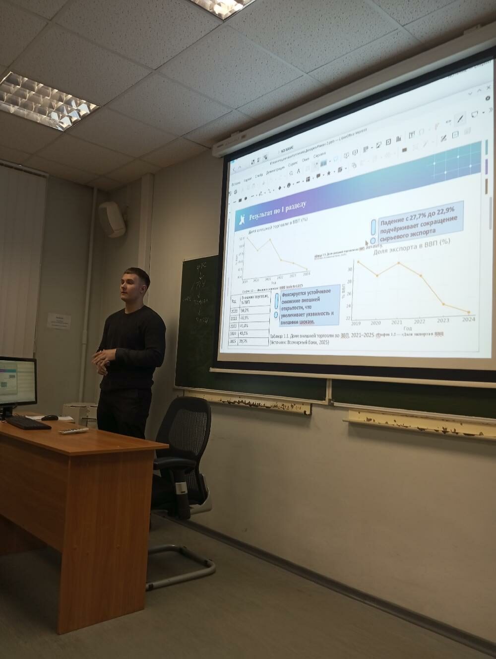 В заседании секции приняли участие студенты 1, 2, 4 и 5 курсов, а также преподаватели кафедры, что обеспечило широкую дискуссионную платформу и межкурсовое научное взаимодействие. Студенты представили доклады по актуальным направлениям экономической безопасности: от проблематики высокотехнологичных отраслей и перспектив развития микроэлектроники до вопросов правовой безопасности самозанятых, налоговой устойчивости регионов, финансового контроля в промышленности, стратегий обеспечения безопасности на микроуровне управления и анализа отраслевой специфики, включая судостроение и влияние санкционных ограничений на экономику.