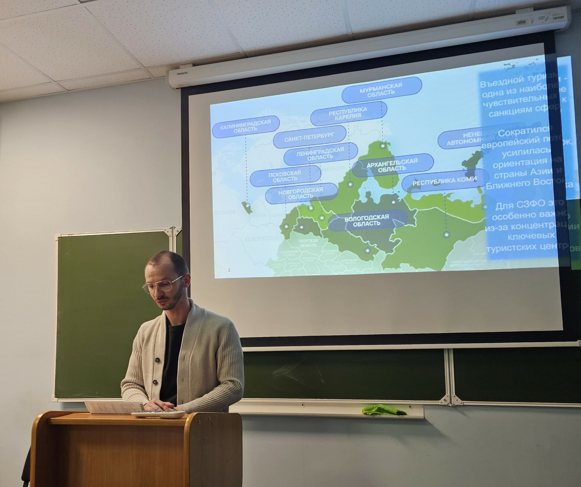 Тема доклада: Трансформация въездного туризма в регионах Северо-Запада России в условиях санкций (на примере проекта «Серебряное ожерелье России»). Научный руководитель — доцент Воловода А.В.