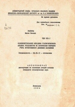 Волкова, И.Ю. Совершенствование методики статистического анализа рождаемости по материалам текущего учета естественного движения населения : автореферат диссертации на соискание ученой степени кандидата экономических наук: 08.00.01 — статистика / Волкова Илона Юловна ; [Ленингр. фин.-экон. ин-т им.Н.А.Вознесенского] . — Ленинград : [б. и.], 1984 . — 17 с., включ. обл. — Другие кн. этого авт. см. под фамилией: Парик Илона Юловна. — Библиогр.: с. 16-17 (5 назв.).