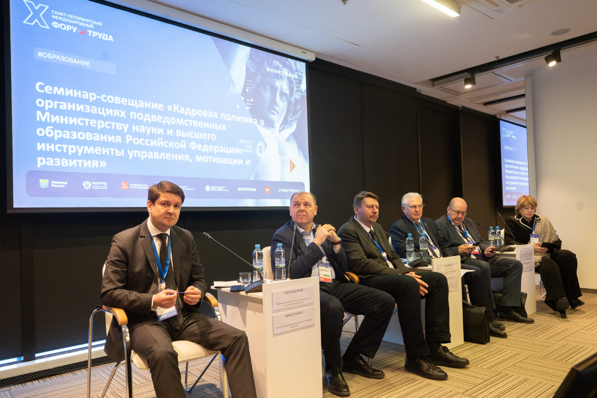 В рамках Форума труда состоялся семинар-совещание «Кадровая политика в организациях подведомственных Министерству науки и высшего образования Российской Федерации: инструменты управления, мотивации и развития», организованный при участии СПбГЭУ. Модератором выступил ректор университета Игорь Максимцев.