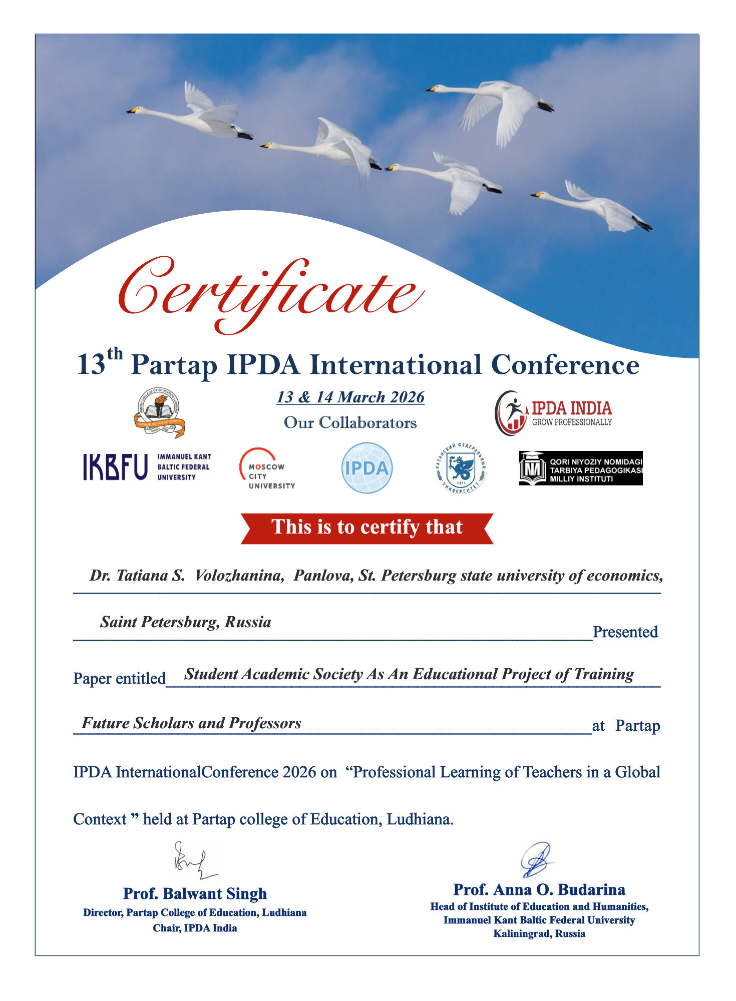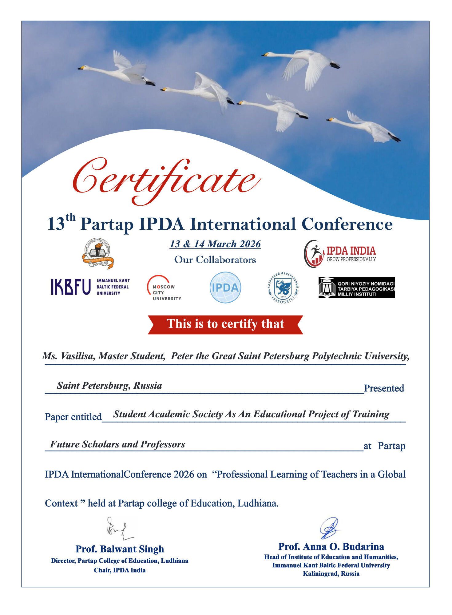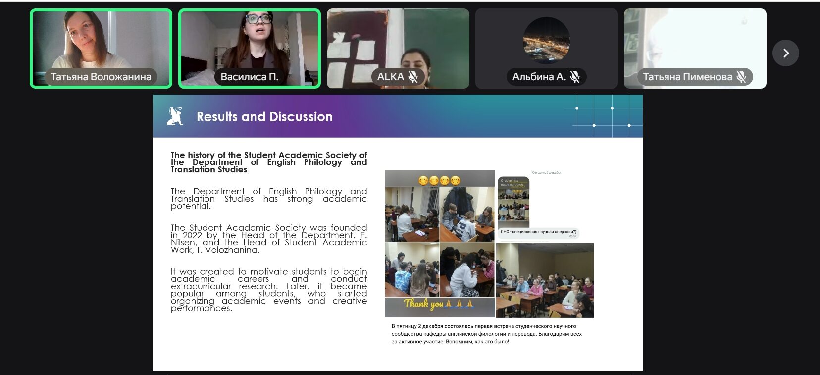 В рамках участия в конференции авторами была подготовлена научная статья на английском языке, посвященная роли студенческого научного общества (СНО) в воспитании будущих исследователей и преподавателей. В работе рассматриваются вопросы вовлеченности студентов в научную деятельность, факторы, влияющие на формирование интереса к исследованиям, а также опыт участия в СНО как инструмент развития коммуникативных навыков, преодоления страха публичных выступлений и раскрытия творческого потенциала обучающихся.