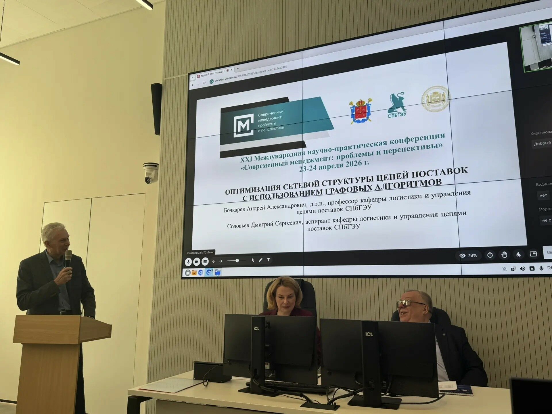 Профессор А.А. Бочкарев представил доклад, посвященный оптимизации сетевой структуры цепей поставок с использованием графовых алгоритмов, а профессор В.В. Борисова рассмотрела вопросы цифрового лидерства в логистике.