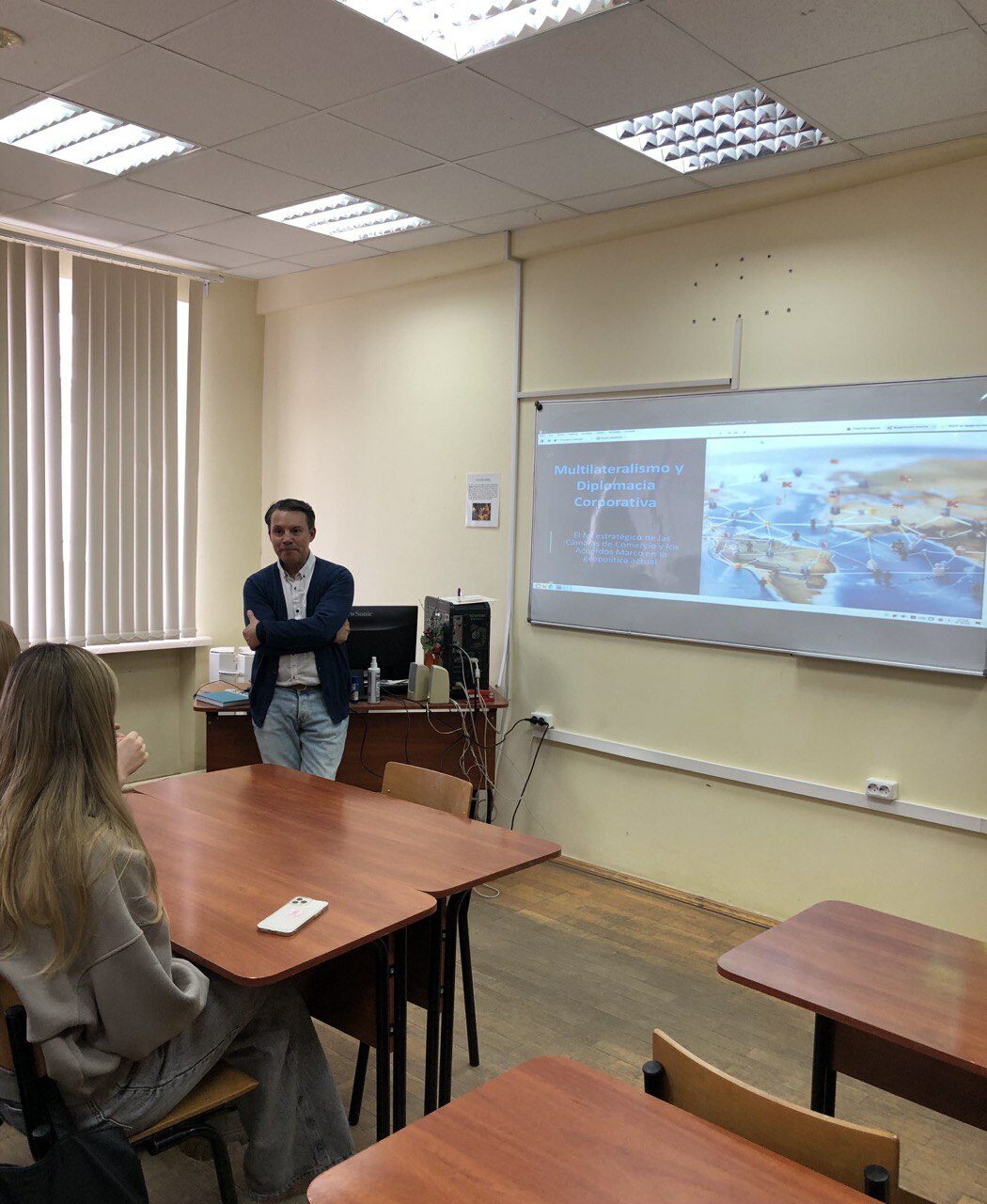 На лекции присутствовали студенты специализаций «Международные отношения» и «Лингвистика», участвовавшие в обсуждении современных подходов к многосторонней корпоративной дипломатии и международному сотрудничеству, преподаватели испанского языка Елизавета Куцубина и Евгения Подоляк-Рунова, а также помощник почетного консула Чили в Санкт-Петербурге Ирина Вострикова.