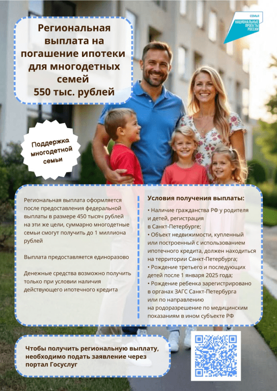 В Санкт-Петербурге 1 млн рублей на погашение ипотеки могут получить многодетные семьи, у которых третий и последующий ребенок родился с 1 января 2025 года.