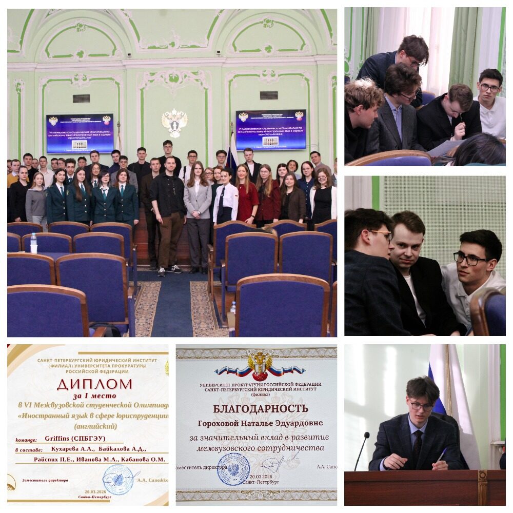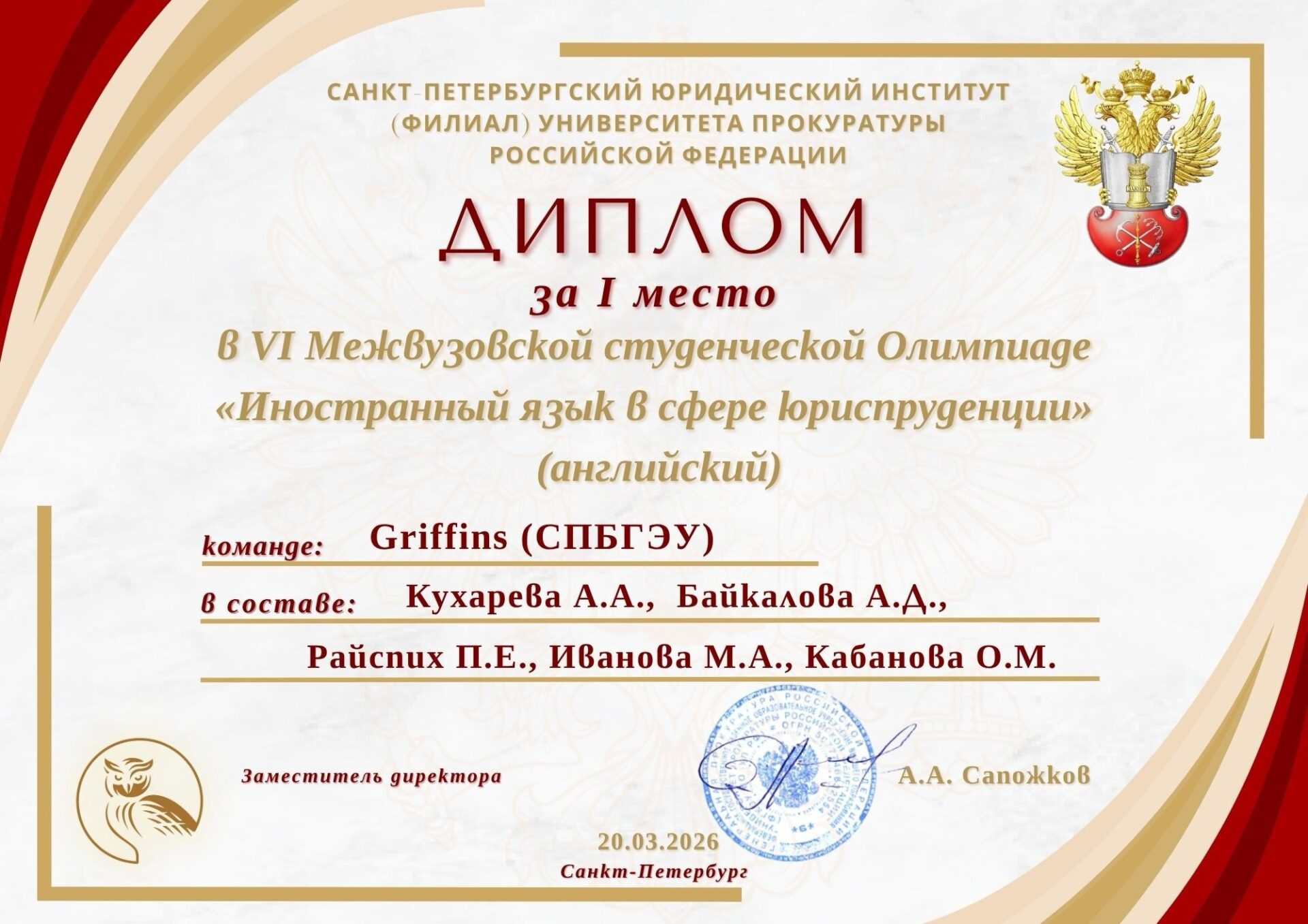 Команда второго курса юридического факультета «Griffins» (Кабанов Олег, Байкалов Андрей, Иванов Максим, Кухарев Алексей, Райспих Павел) под руководством кафедры английского языка №2 заняла первое место на VI Межвузовской студенческой Олимпиаде «Иностранный язык в сфере юриспруденции» 20 марта 2026 года в Санкт-Петербургском юридическом институте (филиале) Университета прокуратуры РФ.