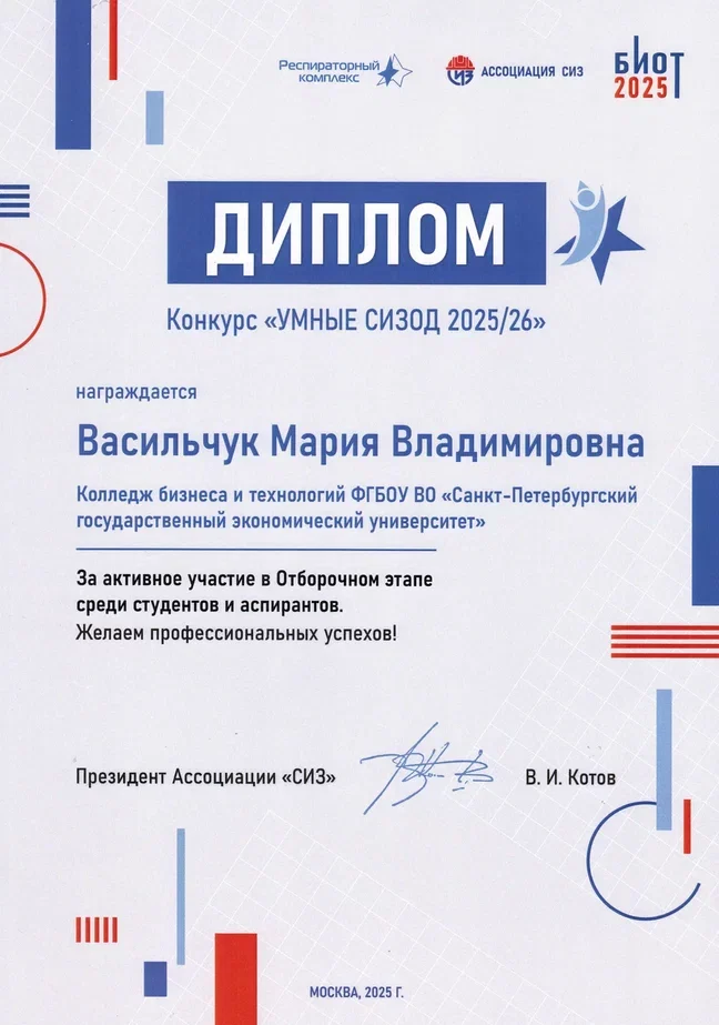 6 ноября студентка группы ТХ-2491 специальности «Технология продуктов питания из растительного сырья» Мария Васильчук приняла участие в отборочном этапе Национального конкурса «Умные СИЗОД 2025/26» в Центре деловых коммуникаций.