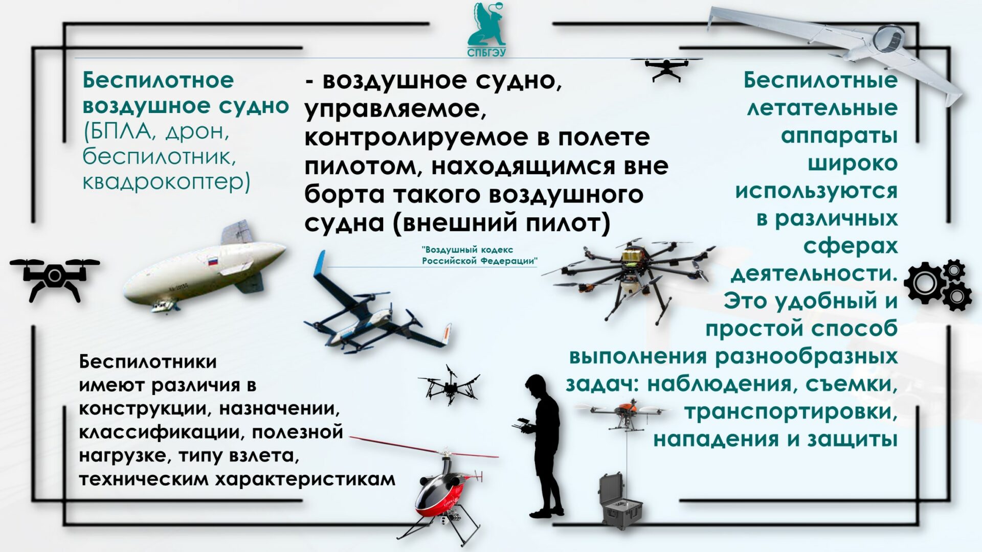 Учебное пособие предназначено для изучения материала, касающегося БПЛА, их видов и типов. Имеются задания для самостоятельного выполнения для закрепления полученных знаний.