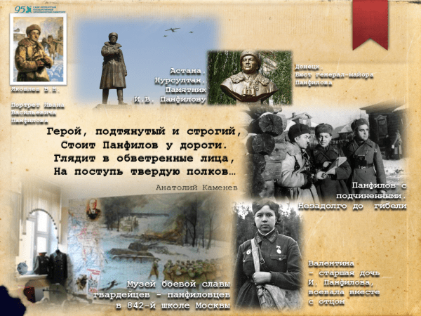 Выдающийся советский военачальник, генерал-майор, Иван Васильевич Панфилов, прославился во время боев за Москву осенью 1941 года в районе Волоколамска. Проявив личную храбрость и героизм, Панфилов умело организовал сопротивление частей 316-й стрелковой дивизии наступлению вермахта на волоколамском направлении. Солдаты Панфилова стояли насмерть против превосходящих сил противника, удерживая позиции.