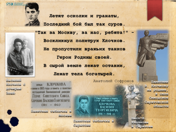 «Родина никогда не забудет героических подвигов Василия Георгиевича, его имя войдет в историю лучших людей, погибших, защищая Родину» — из письма командира подразделения Гундиловича родным В. Клочкова.