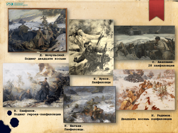 Художественная трактовка образа панфиловцев предпринималась в военное и послевоенное время многими живописцами. Самым важным для художников было отдать дань памяти погибшим, выразить благодарность и почтение к тем, кто своей отвагой и мужеством освободил родную землю.