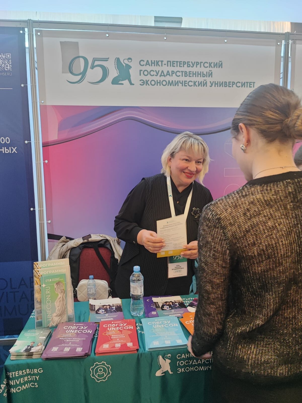 От гуманитарного факультета СПбГЭУ участие в работе образовательной выставки приняла доцент кафедры романо-германской филологии и перевода Наталия Владимировна Гуль, которая представила подробную информацию об образовательных программах и направлениях подготовки как гуманитарного факультета, так и университета в целом.