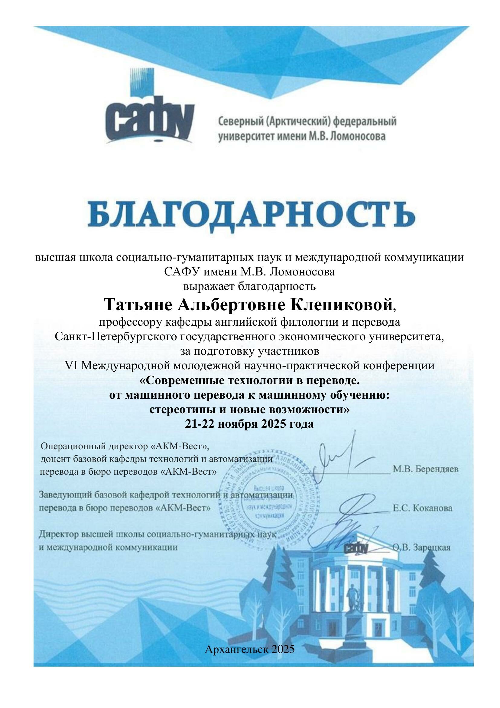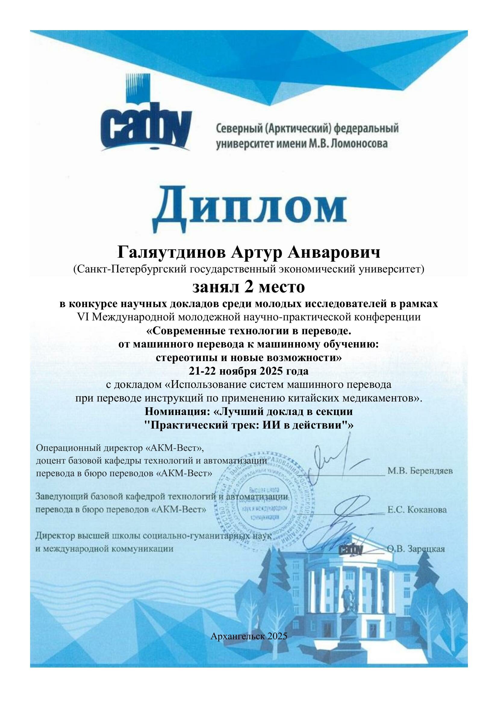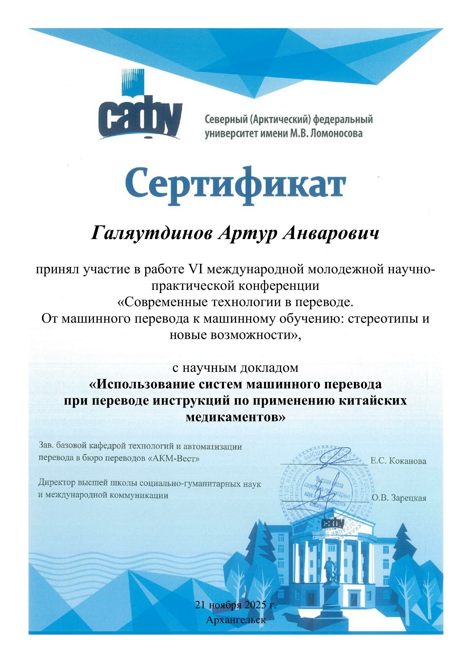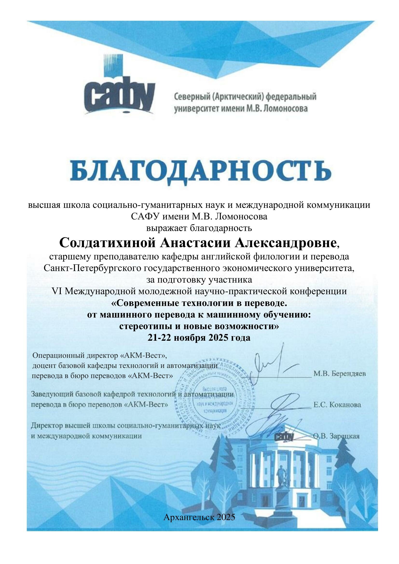 Под руководством старшего преподавателя кафедры английской филологии и перевода СПбГЭУ Солдатихиной Анастасии Александровны студент 4 курса Галяутдинов Артур (Л-2208) подготовил и представил научный доклад на тему «Использование систем машинного перевода при переводе инструкций по применению китайских медикаментов».