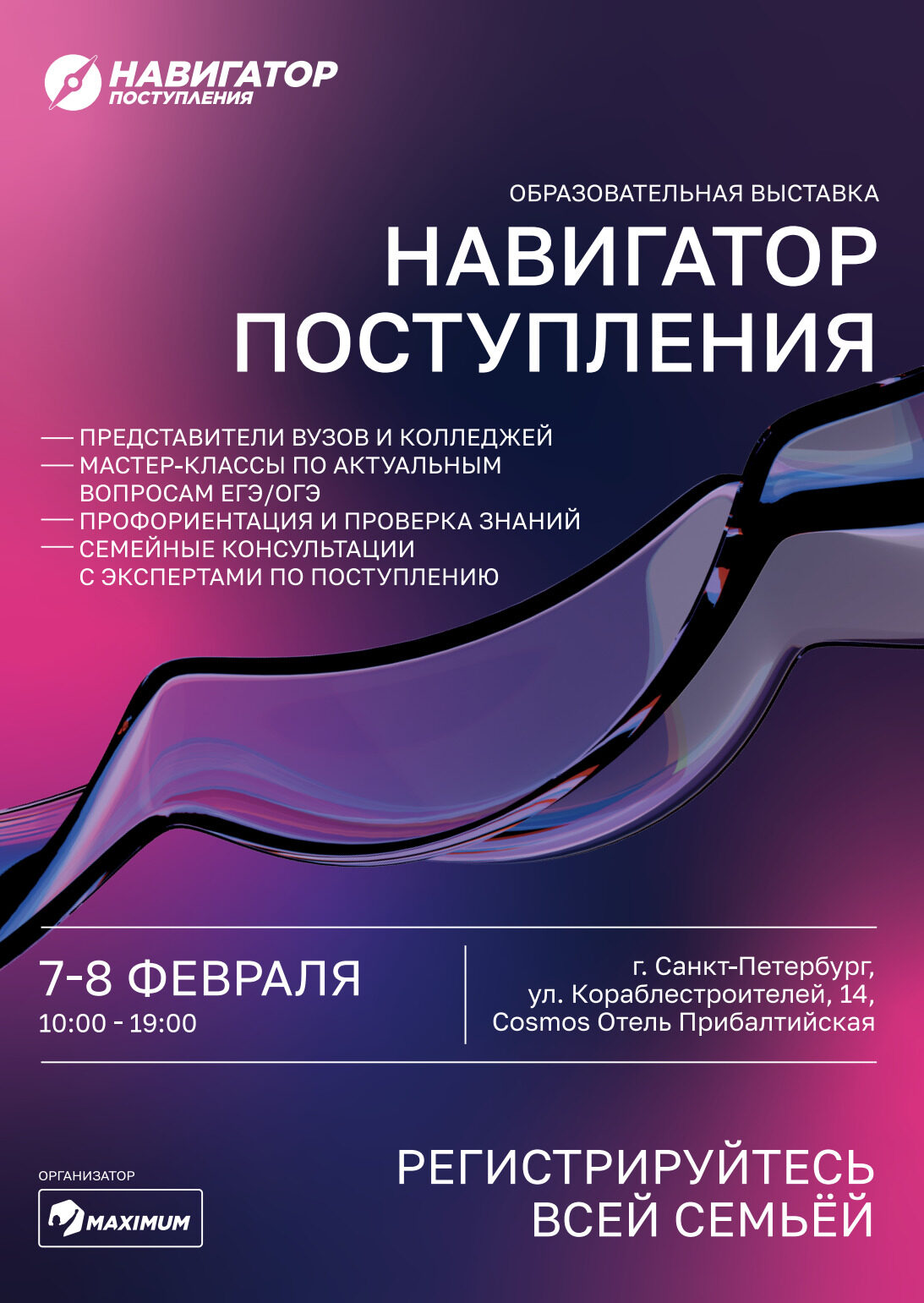 Уважаемые абитуриенты! Приглашаем вас посетить крупнейшую образовательную выставку «Навигатор Поступления», которая пройдет в Санкт-Петербурге 7-8 февраля.
