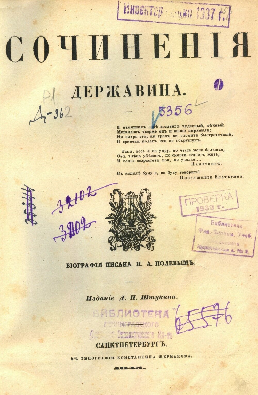 Державин, Гавриил Романович. Сочинения Державина : биография писана Н. А. Полевым. –Санкт-петербург : издание Д. П. Штукина, 1845 (в тип. Константина Жернакова). – XX, 395, IV с., [1] л. портр., [3] л. ил. – На тит. л. экз. N 5356 штемпель: Библиотека Фин.-эконом. учеб. Комбината.