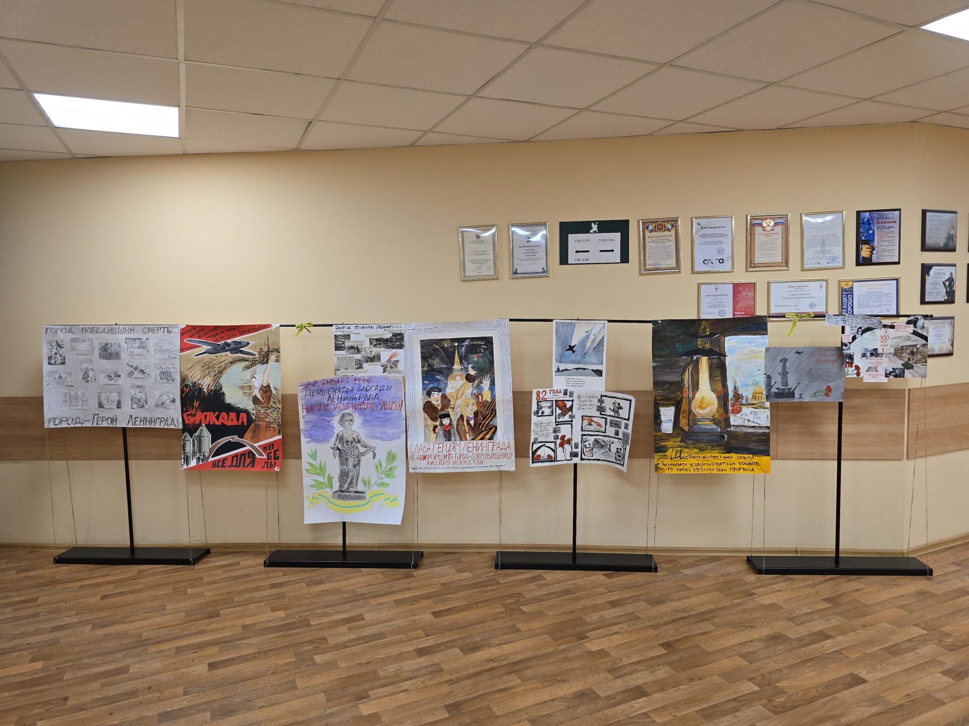 На втором этаже колледжа развернулась настоящая галерея творческих работ студентов: лучшие плакаты, ставшие победителями конкурса плакатов ко Дню прорыва блокады и ко Дню освобождения Ленинграда от фашистской блокады прошлых годов, и новые работы студентов к 82-й годовщине прорыва блокады и 83-й годовщине освобождения города будут украшать рекреацию в течение всей недели.