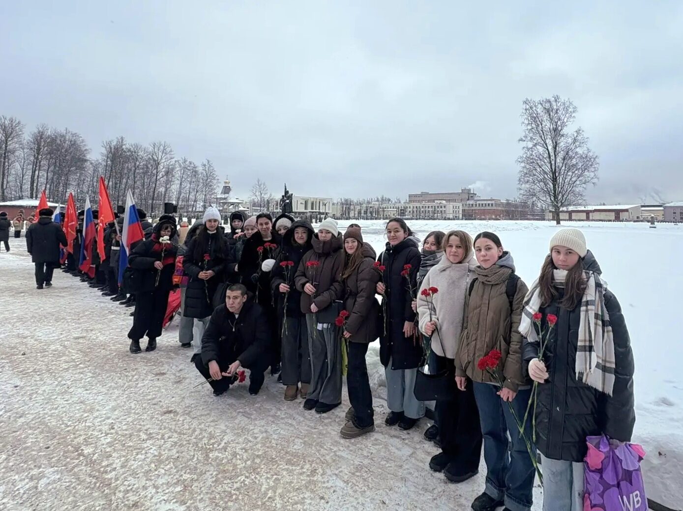 С Администрацией Красногвардейского района студенты возлагали цветы к Мемориалу, погибшим в блокаду, на Большеохтинском кладбище.