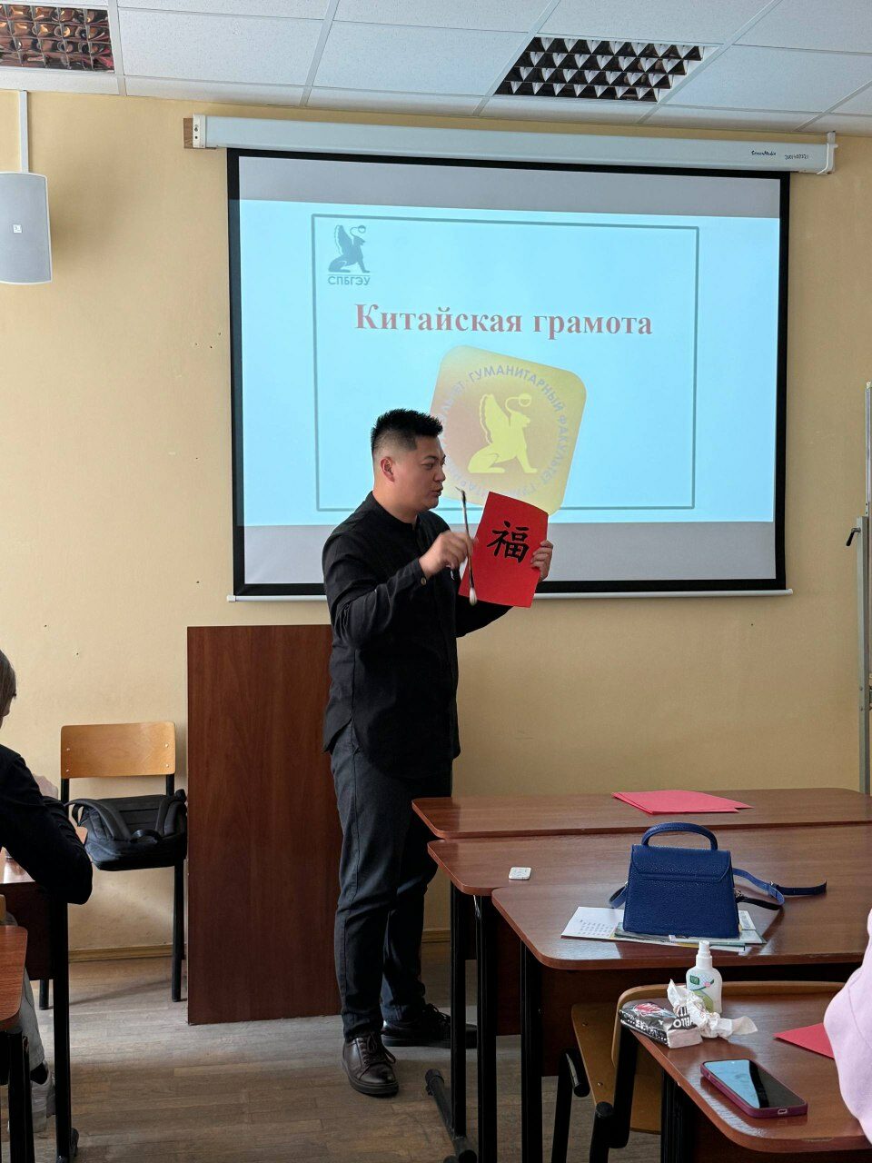 Старший преподаватель кафедры восточных языков Василий Шаньлуевич Сю познакомил ребят с основами китайской письменности. Участники мастер-класса узнали об истории и особенностях иероглифической системы, а затем получили возможность самостоятельно попробовать написать иероглифы. Упражнения проходили в аутентичной форме — ребята писали чернилами на красной бумаге, что добавило атмосферы и усилило интерес к процессу.
