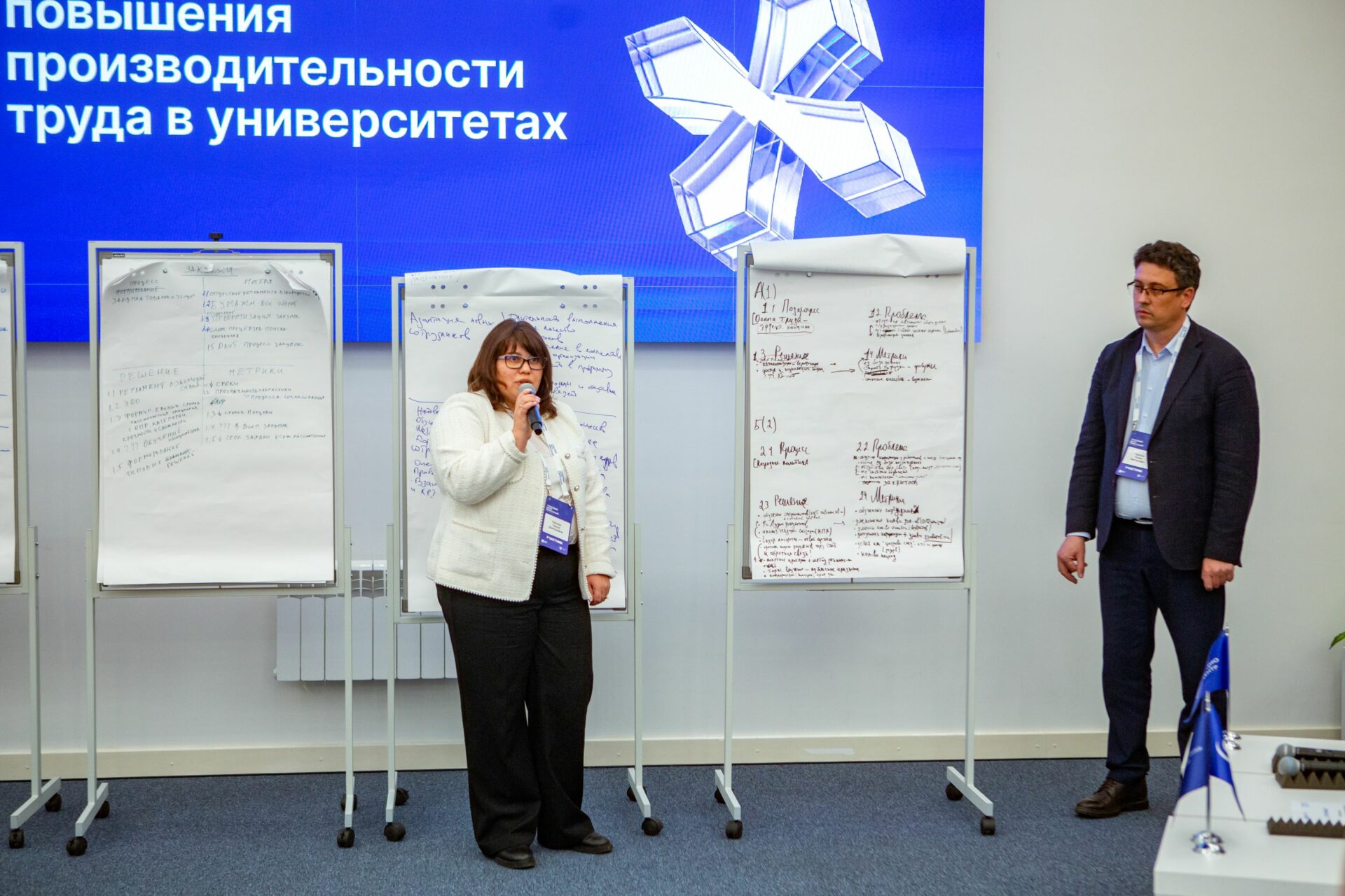 Наш университет представили начальник организационного управления, Алла Клюка и начальник управления по развитию кадрового потенциала и охраны труда, Орыся Маслюк. Мероприятие было направлено на запуск масштабной работы по оптимизации процессов в высшей школе и знакомство университетских команд с конкретными инструментами повышения эффективности, в рамках реализации федерального проекта «Производительность труда». Переход от стратегических целей к практике был реализован в формате специального практикума «Производительность труда в университете: как выявить потери в рутинных процессах». Команды вузов Северо-Западного и Приволжского федеральных округов на конкретных кейсах отрабатывали алгоритмы выявления и устранения потерь в таких процессах, как организация учебной деятельности и управление кампусом. Лучшие наработки были представлены в формате презентаций от каждой группы.