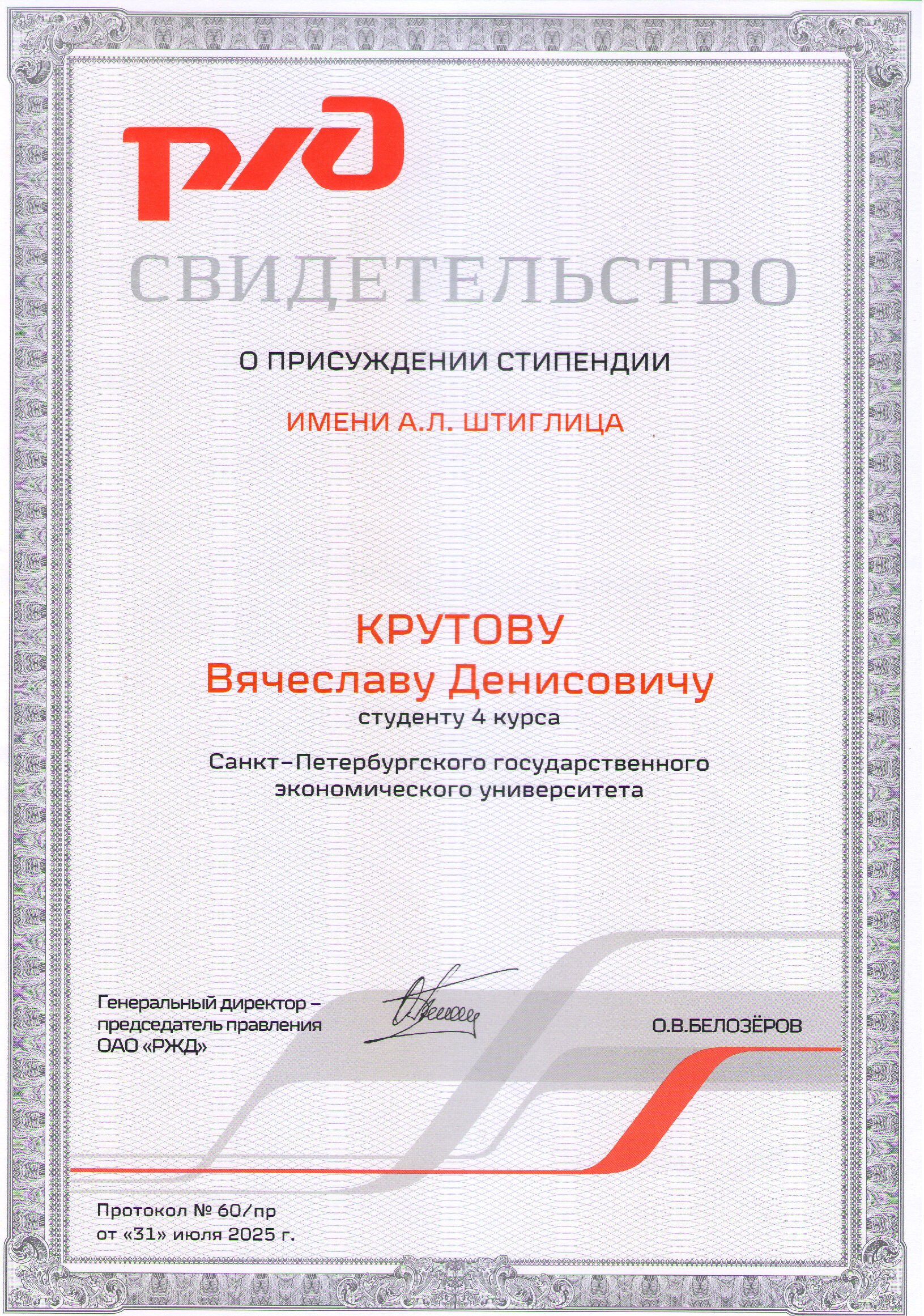 С 01.09.2025 по 31.08.2026 именной стипендии им. А.Л. Штиглица удостоен студент 4 курса ОПОП бакалавриата «Логистика и управление цепями поставок» Крутов Вячеслав (гр. М-2211).