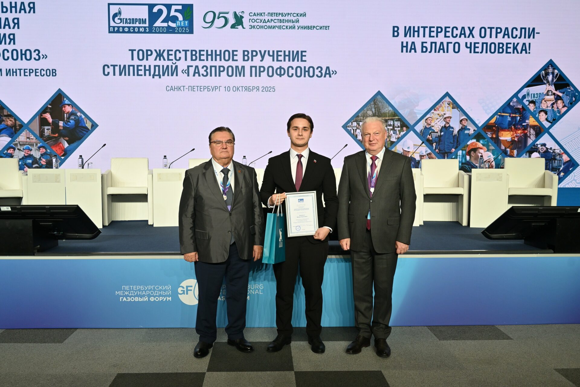 «Заключительный день Петербургского международного газового форума ознаменовался значимым событием – вручением стипендий лучшим студентам от Межрегиональной профсоюзной организации «Газпром профсоюз» в честь ее 25-летия. Эта традиция, поддерживаемая на протяжении нескольких лет, не просто является формой поощрения, но и выполняет стратегическую задачу: создает мощный стимул для будущих специалистов связать свою профессиональную судьбу с компанией. Такое признание заслуг студентов укрепляет престиж работы в «Газпроме» и формирует кадровый резерв, мотивированный на достижение высоких результатов в отрасли», — отметил ректор СПбГЭУ Игорь Максимцев.