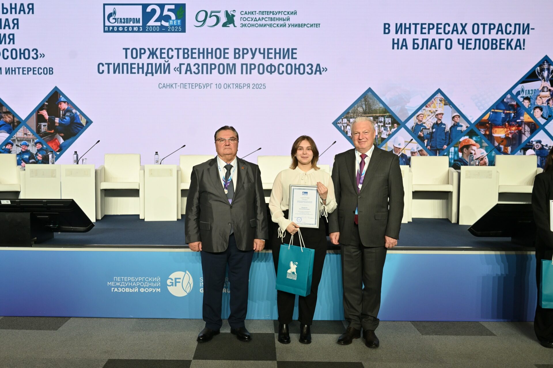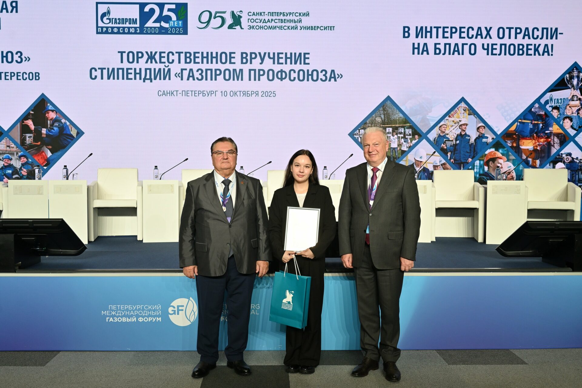 10 октября в рамках ПМГФ-2025 Санкт-Петербургский государственный экономический университет и Межрегиональная профсоюзная организация «Газпром профсоюз» наградили победителей стипендиальной программы именных стипендий Председателя «Газпром профсоюз».