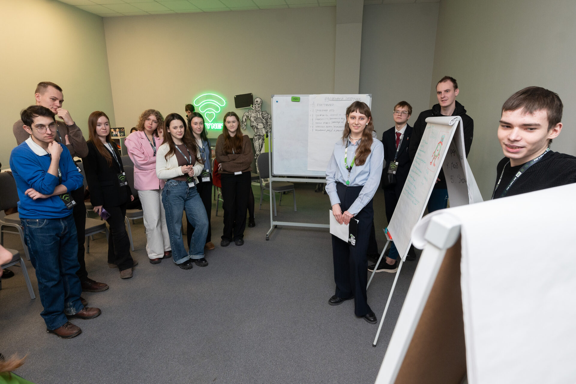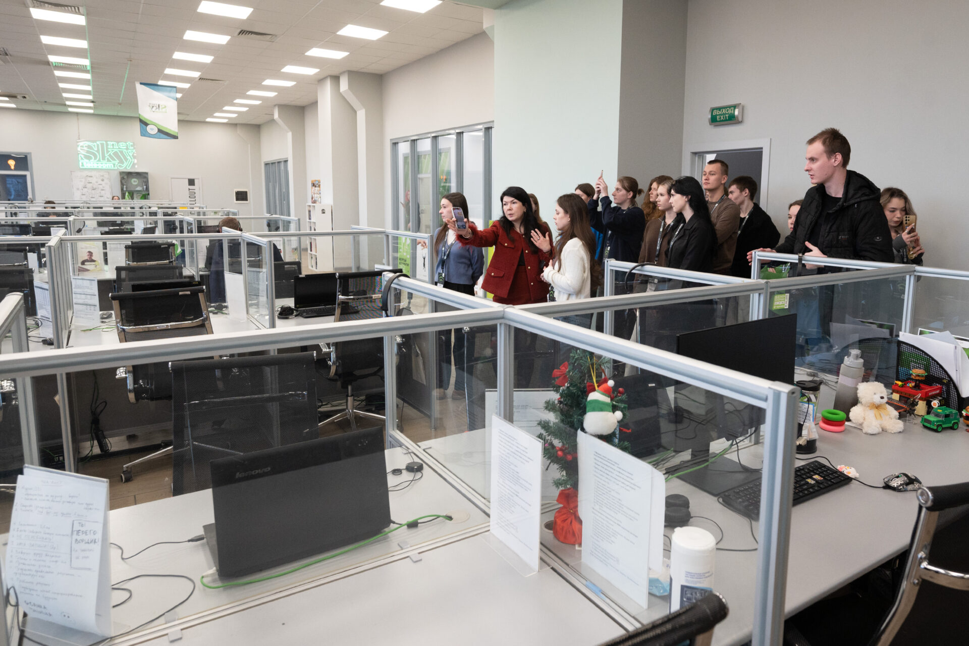 Экскурсия началась со знакомства с компанией – участники узнали об истории создания SkyNnet, познакомились с корпоративной культурой, благотворительными проектами и активностями, которые проводятся для сотрудников. Тем, кто увлекается онлайн играми, было интересно услышать про турнир для кибеспростменов – все желающие смогли присоединиться к сообществу геймеров по qr-коду с презентации.