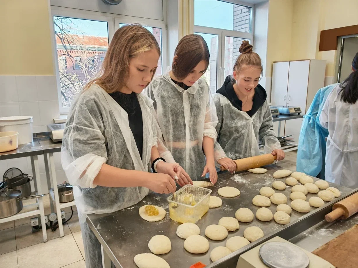 Под руководством преподавателя Натальи Ивановны Токаревой ребята пекли пирожки с начинкой из яблок, проверяли качество сушек маковых по органолептическим показателям, посмотрели фильм «Путь хлеба» и в рамках Года защитника Отечества ролик «Работа хлебозавода в годы войны».