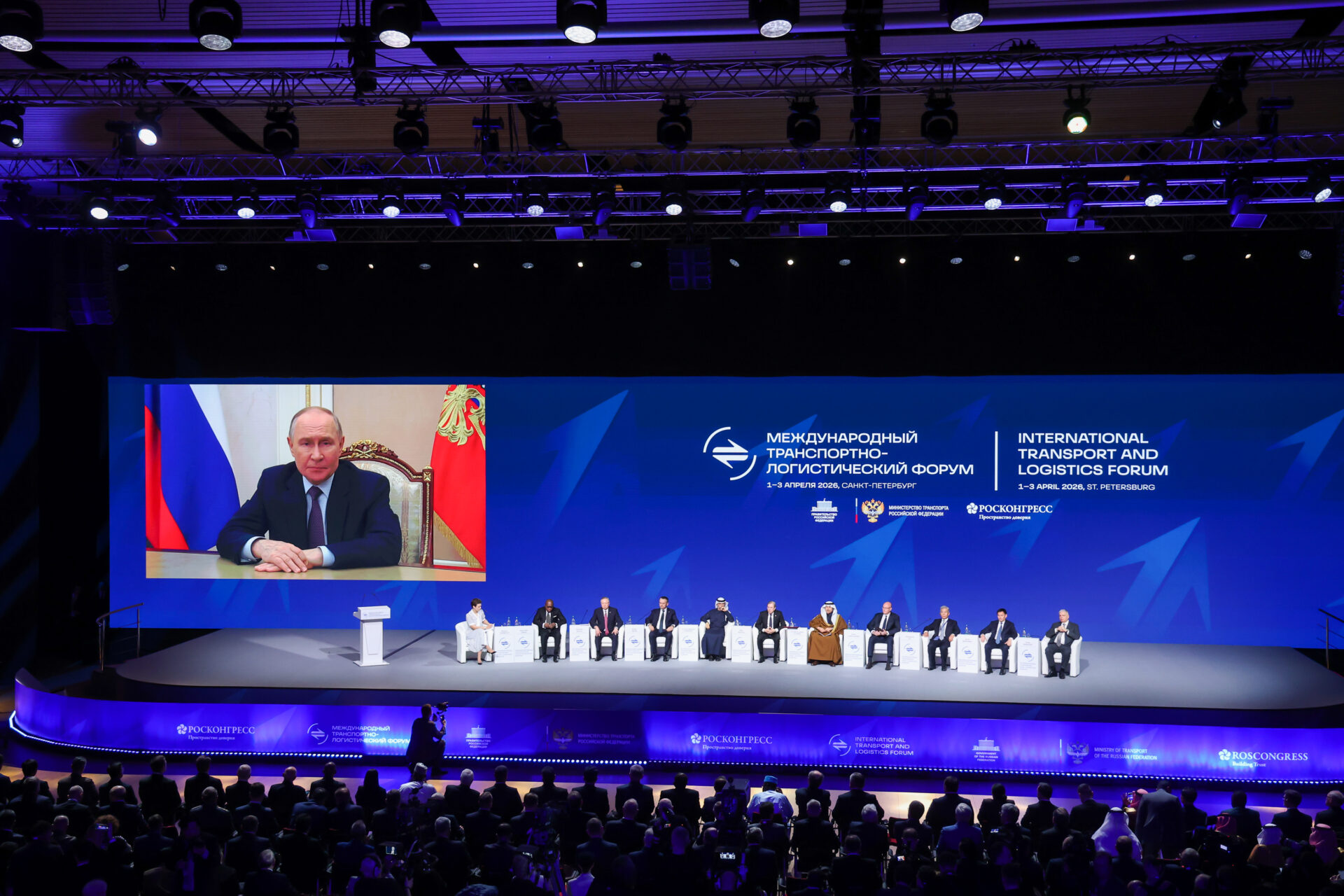 Пленарное заседание «Мировые транспортные коридоры: интеграция и «бесшовная логистика» открыл по видеосвязи Президент Российской Федерации В.В. Путин, по поручению которого был организован этот представительный форум.