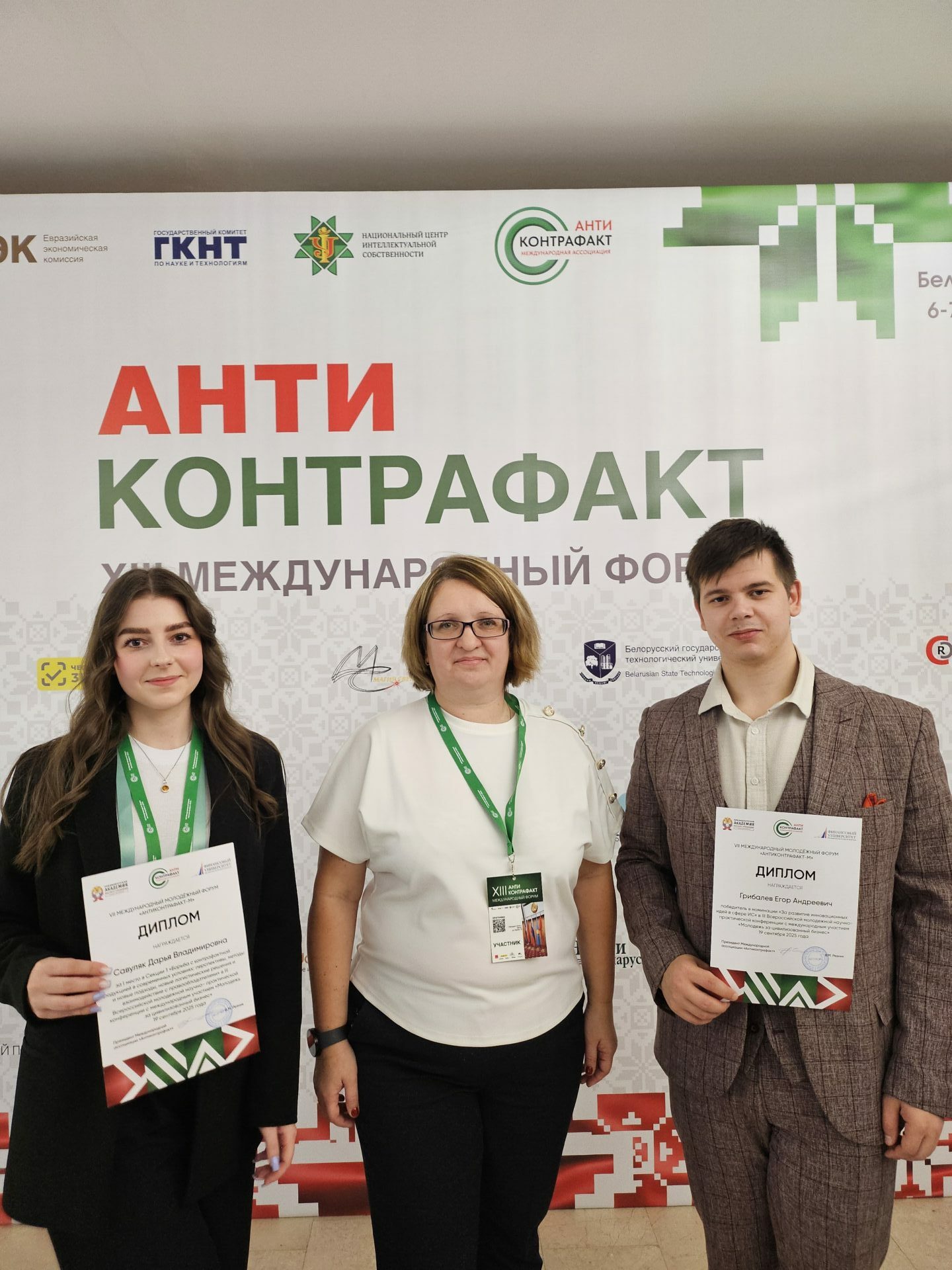6-7 октября 2025 года студенты 4 курса специальности «Таможенное дело» Савуляк Дарья и Грибалев Егор вместе с научным руководителем — доцентом кафедры таможенного дела Пластуняк Ириной Александровной, приняли участие в VII Международном молодежном форуме «Антиконтрафакт — М» в городе Минске (Республика Беларусь).