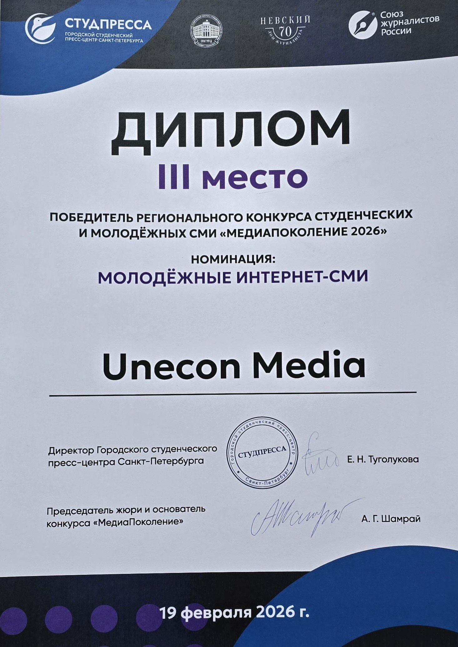 Молодежное интернет-СМИ Unecon media, запущенное в СПбГЭУ в июле 2025 года, уже заявило о себе на профессиональной площадке и заняло третье место в конкурсе «Медиапоколение — 2026».