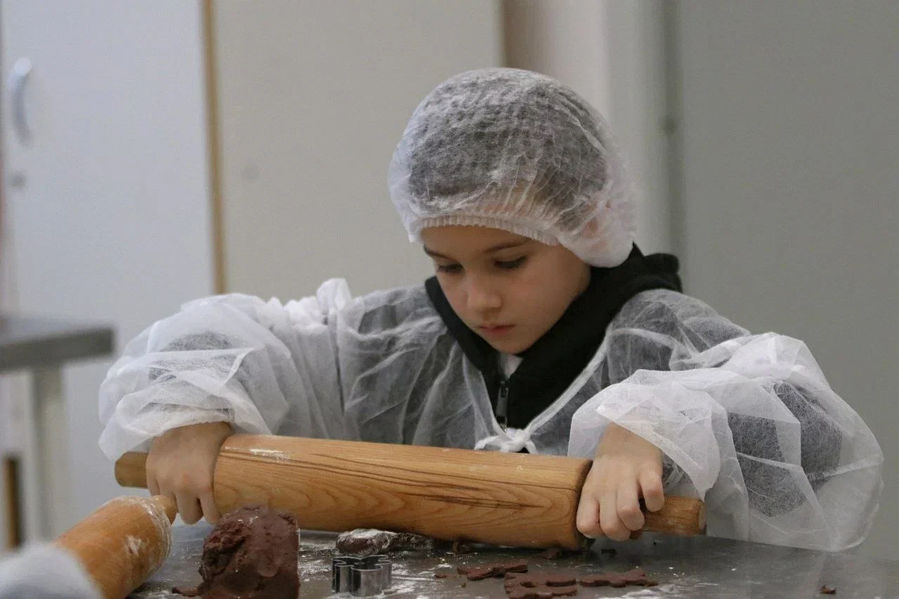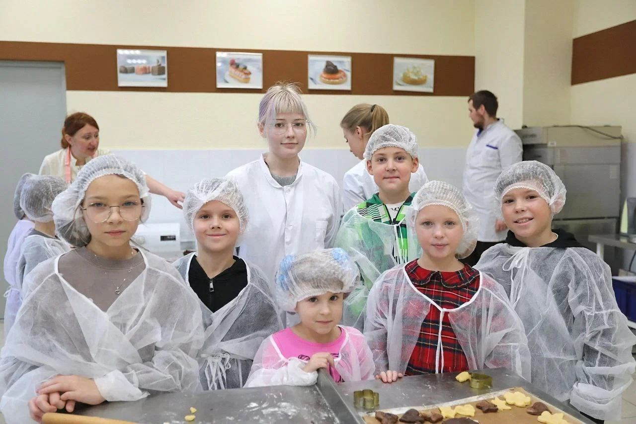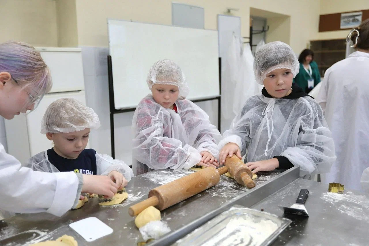 Далее детей отвели на кухню колледжа, где они под присмотром кураторов замешивали тесто, раскатывали его скалкой, придавали форму будущему печенью и наблюдали за процессом выпечки. Под руководством студентов и преподавателей Колледжа участники попробовали свои силы в кулинарии и приняли участие в интерактивном квесте «Хлеб всему голова!»