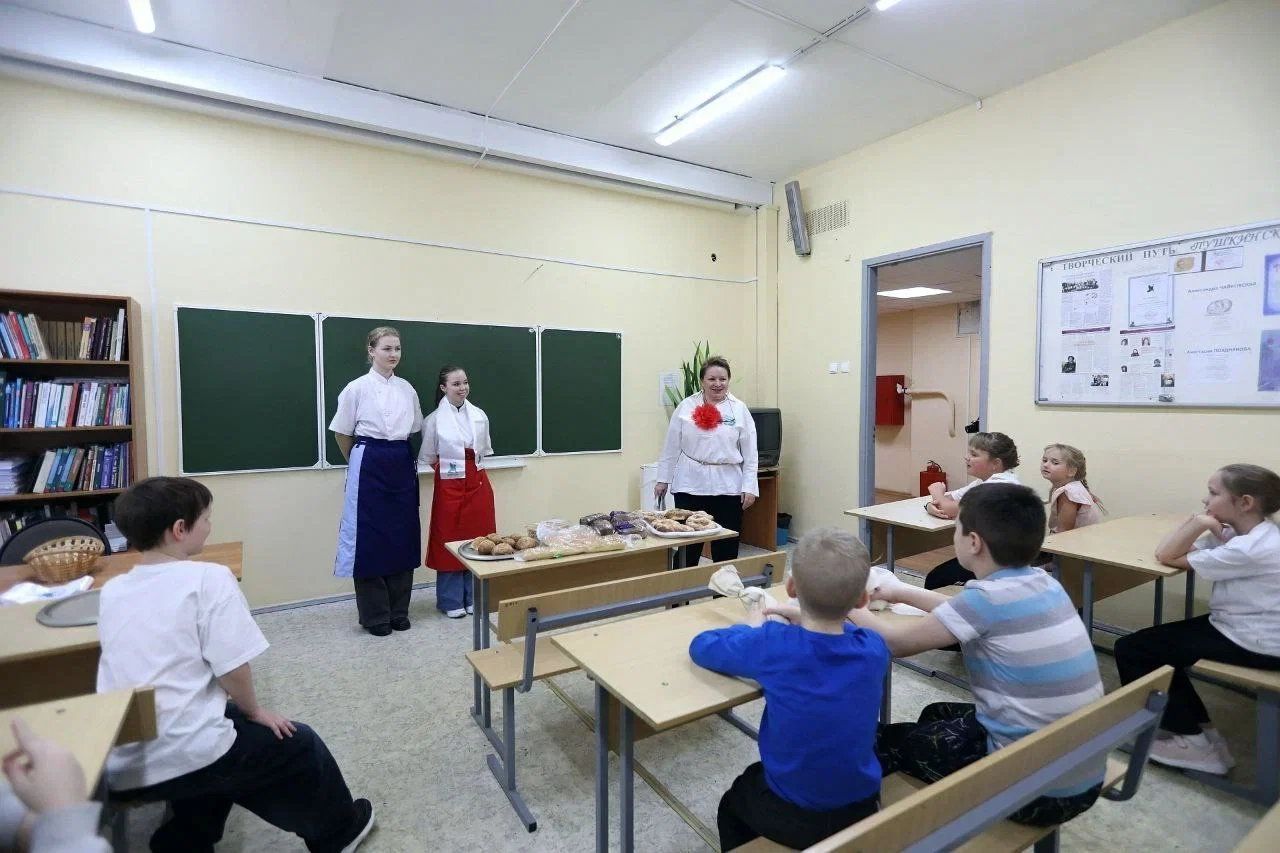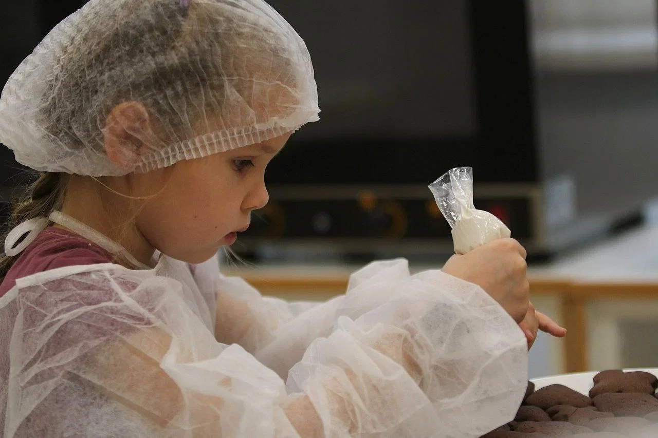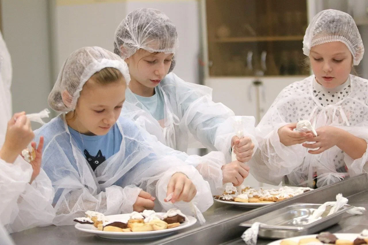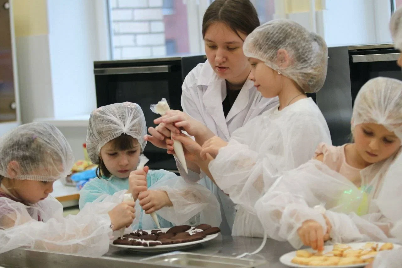 Далее детей отвели на кухню колледжа, где они под присмотром кураторов замешивали тесто, раскатывали его скалкой, придавали форму будущему печенью и наблюдали за процессом выпечки. Под руководством студентов и преподавателей Колледжа участники попробовали свои силы в кулинарии и приняли участие в интерактивном квесте «Хлеб всему голова!»