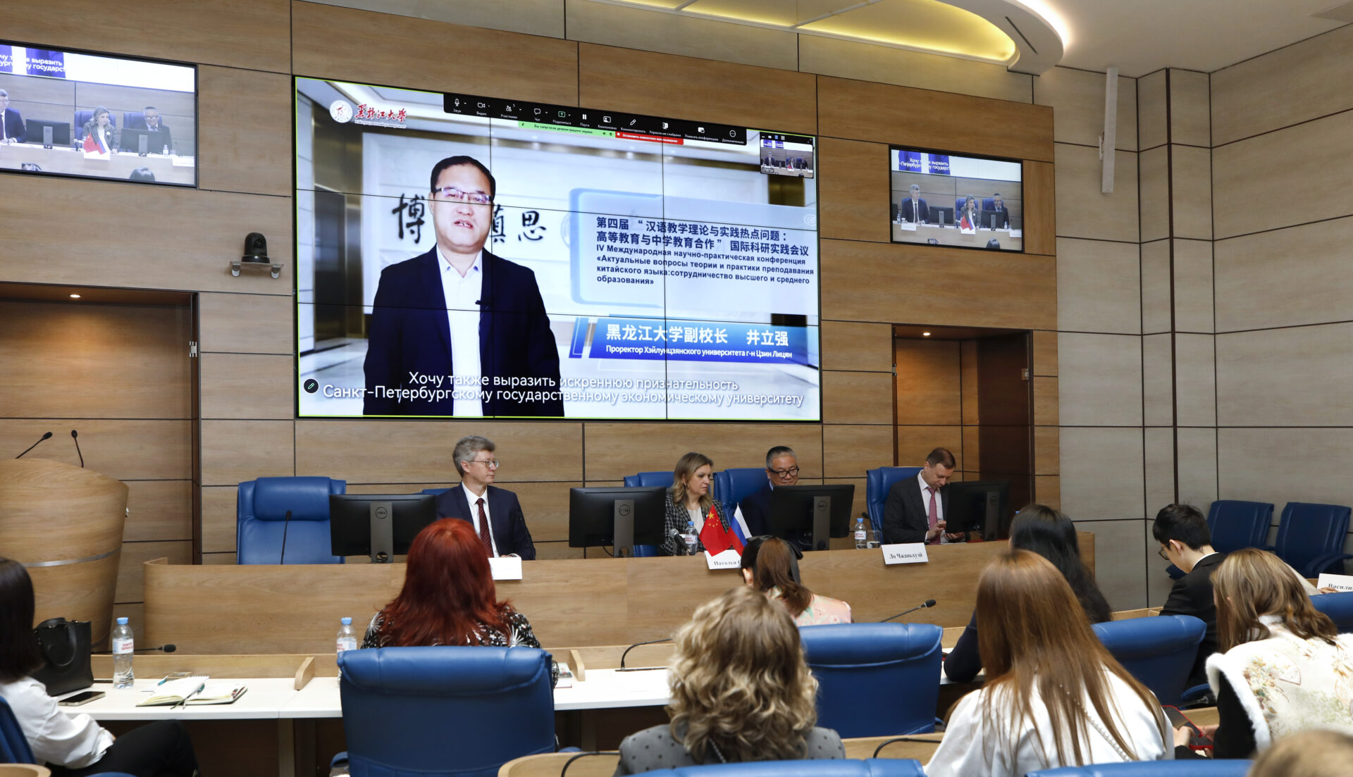 От имени Хэйлунцзянского университета участников конференции поприветствовал проректор Цзин Лицян: «Между Хэйлунцзянским университетом и Санкт-Петербургским государственным экономическим университетом сложились добрые партнерские и дружеские отношения. Наше практическое взаимодействие в области академических обменов, взаимных визитов и преподавания китайского языка неизменно достигает плодотворных результатов. Мы готовы рассматривать данную конференцию как новую отправную точку для дальнейшего углубления сотрудничества между двумя университетами. Убеждён, что совместными усилиями мы сможем создать образцовую модель китайско-российского сотрудничества в сфере образования».