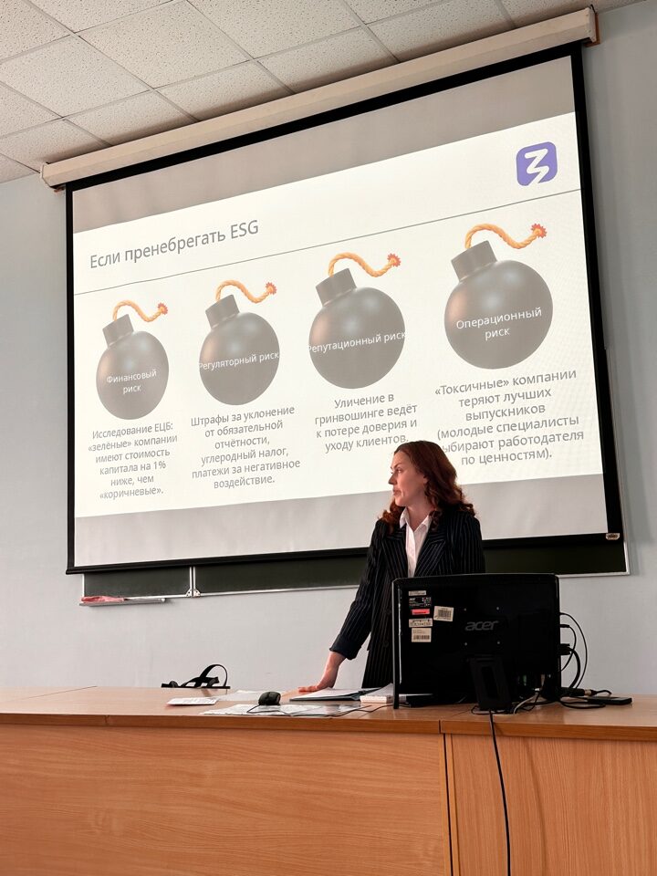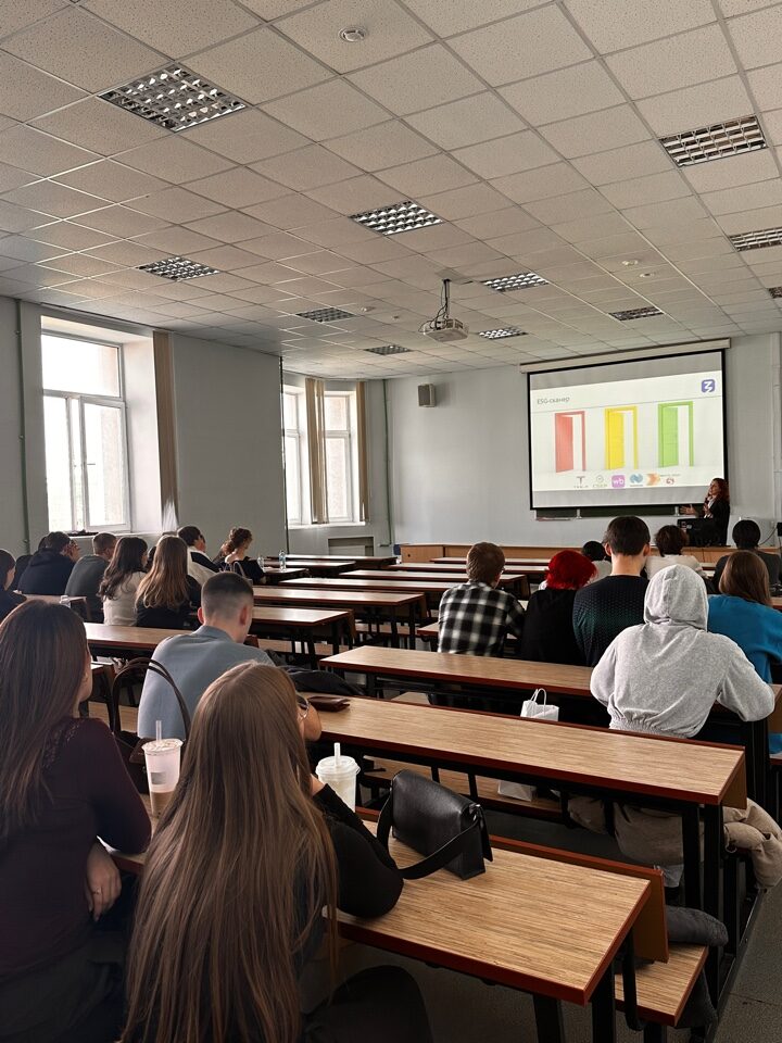 Лекция была организована при поддержке кафедры менеджмента и инноваций СПбГЭУ. В ходе лекции студентам рассказали о особенностях внедрения ESG-практик в современном бизнесе, раскрыли каждую компоненту ESG-трансформации, особый упор был сделан на корпоративную составляющую, так как в настоящее время много предприятий строят бизнес-модели с использованием ESG-технологий, также в конце лекции были рассмотрены кейсы, связанные с ESG-переходом.