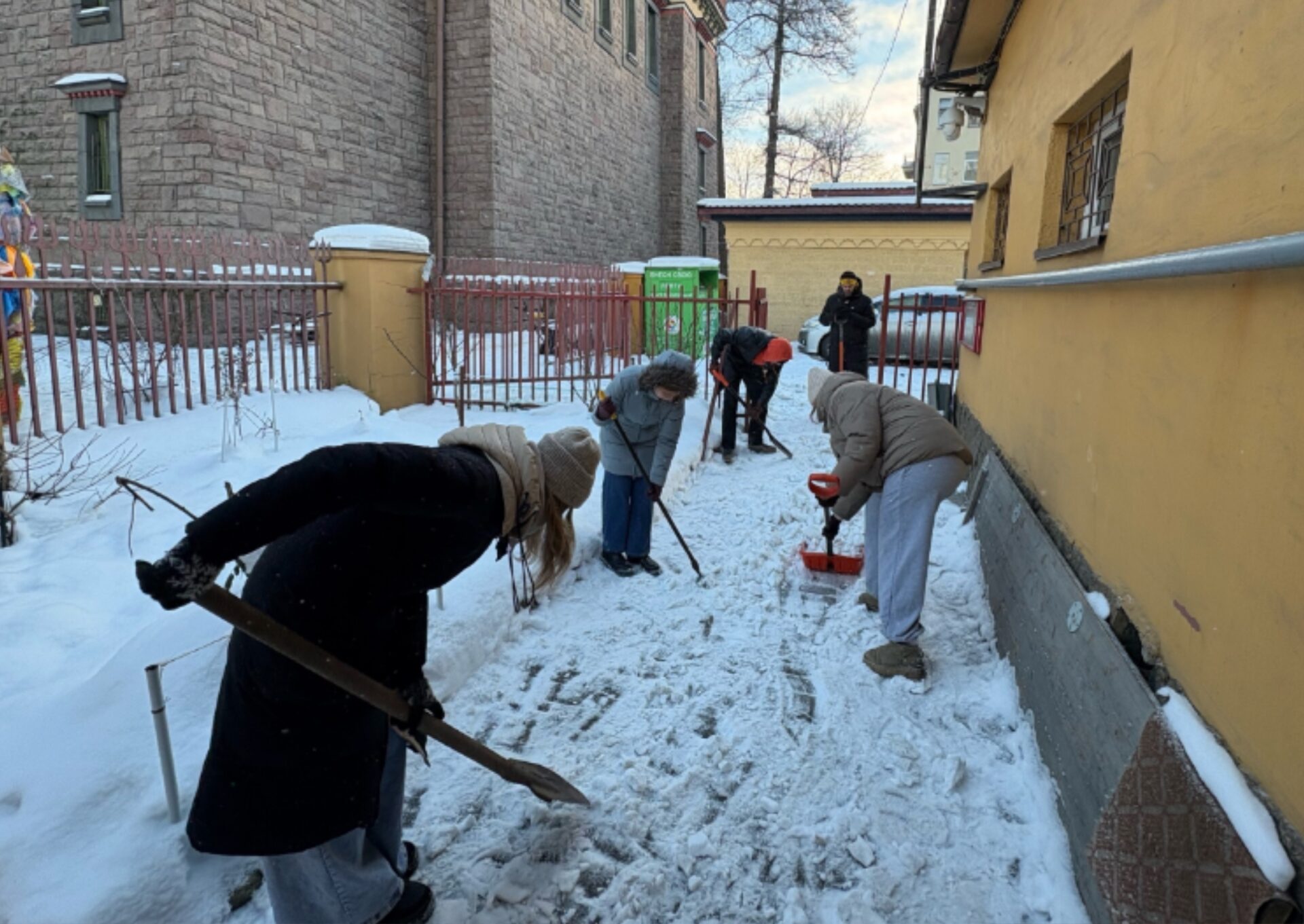 Основной практической задачей для ребят стала помощь в зимнем содержании территории объекта культурного наследия. С энтузиазмом расчистив от снега и наледи дорожки и площадки вокруг храма, студенты обеспечили безопасный доступ для прихожан и многочисленных гостей дацана.