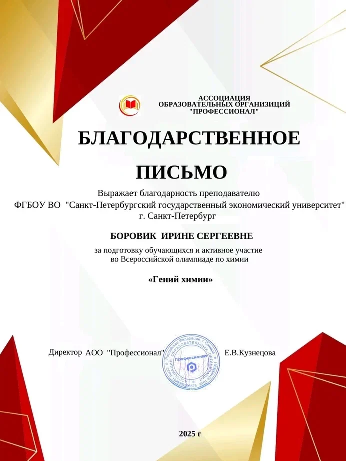 Ассоциация образовательных организаций «Профессионал» выражает благодарность за подготовку обучающихся и активное участие в олимпиаде преподавателю Боровик И.С.