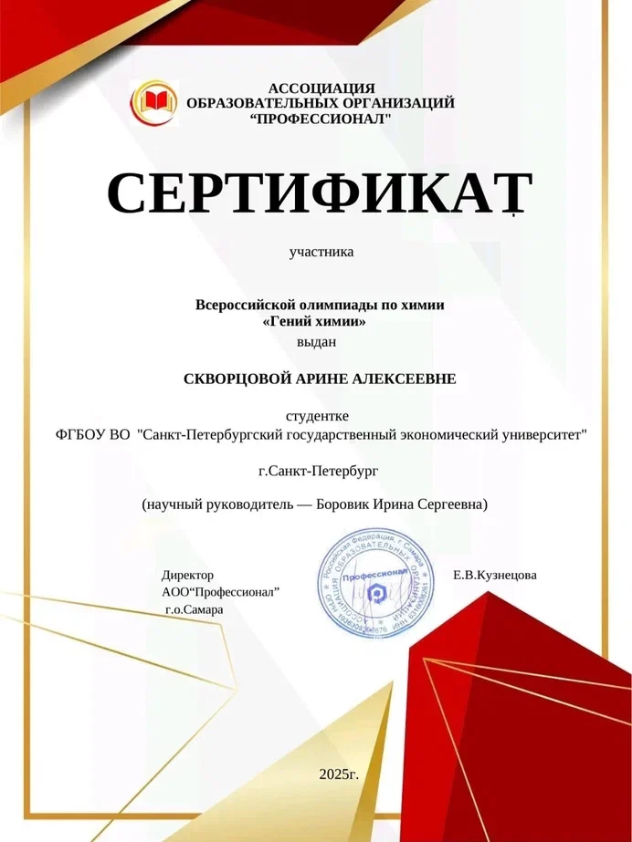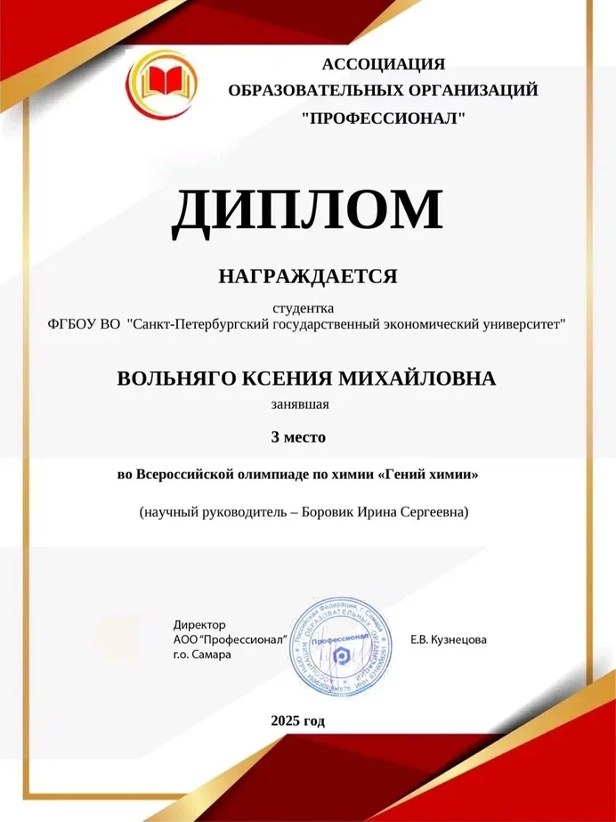 17 декабря 2025 года Ассоциация образовательных организаций «Профессионал» совместно с ГБПОУ «СМК им. Н. Ляпиной» провели Всероссийскую олимпиаду по химии «Гений химии», в которой приняли участие студенты Колледжа бизнеса и технологий СПбГЭУ.