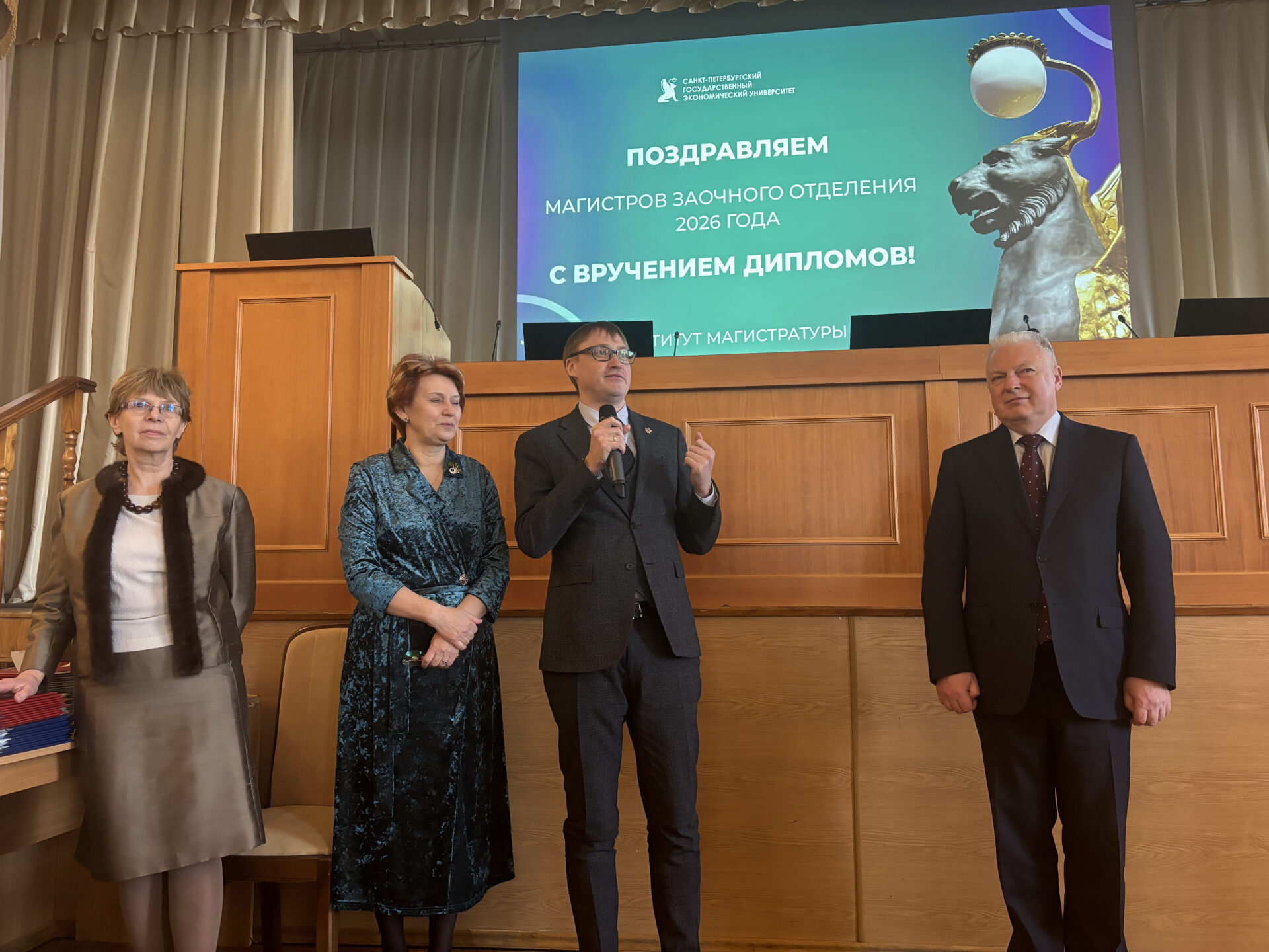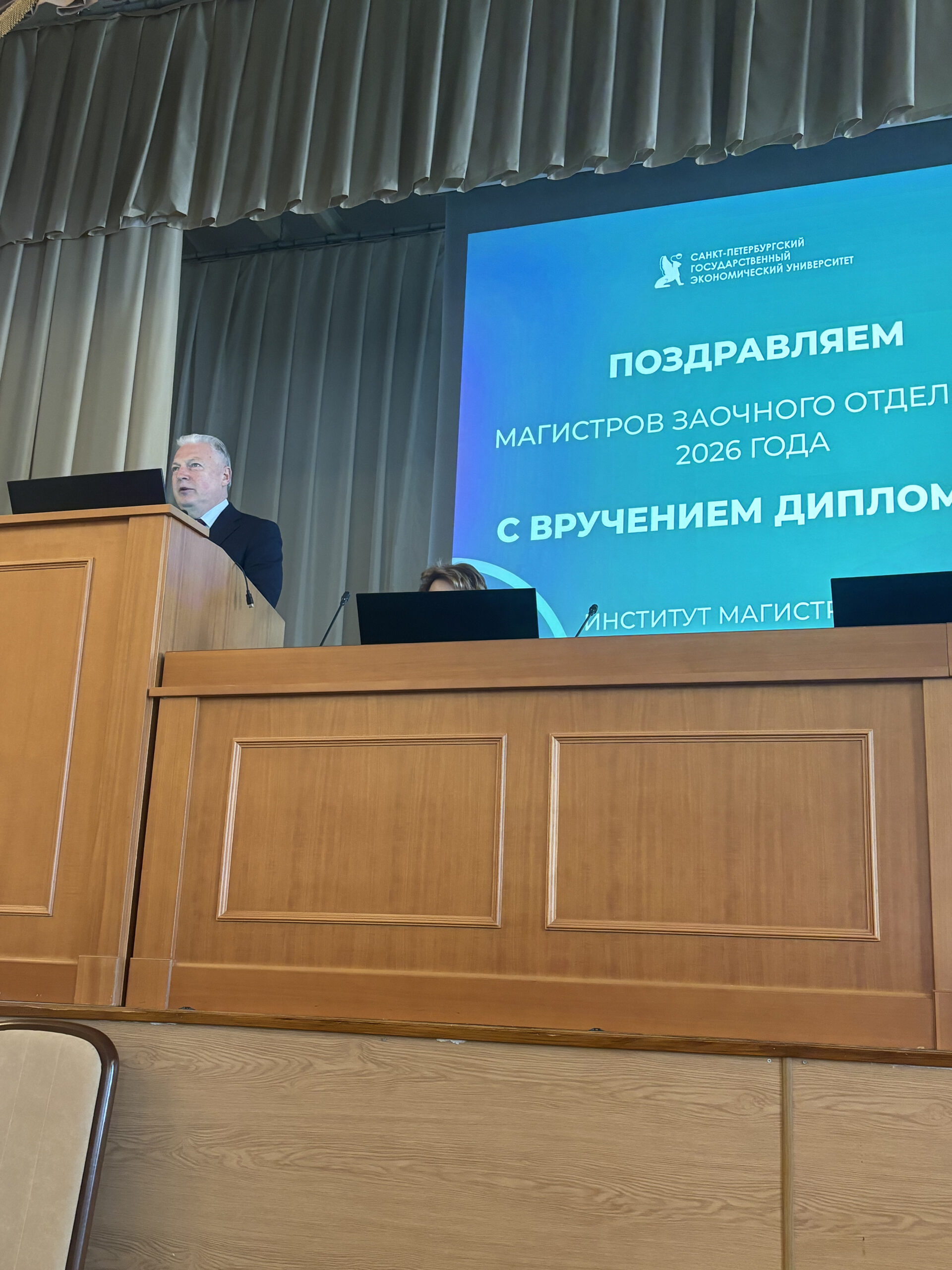 Выпускники получили поздравления от ректора Санкт-Петербургского государственного экономического университета, профессора Максимцева Игоря Анатольевича. Напутствия выпускникам дали проректор по социальной и воспитательной работе, профессор Гришин Сергей Юрьевич, и директор института магистратуры, профессор Тумарова Татьяна Гельцевна.